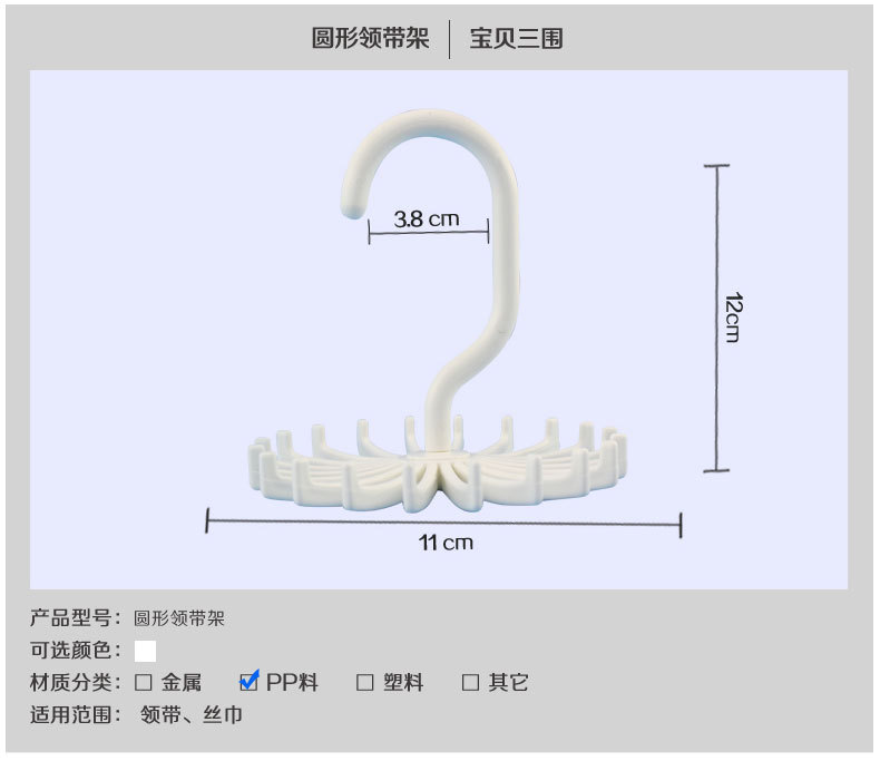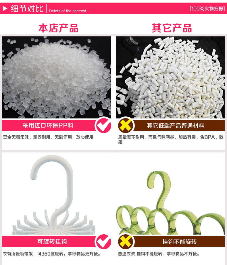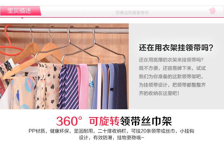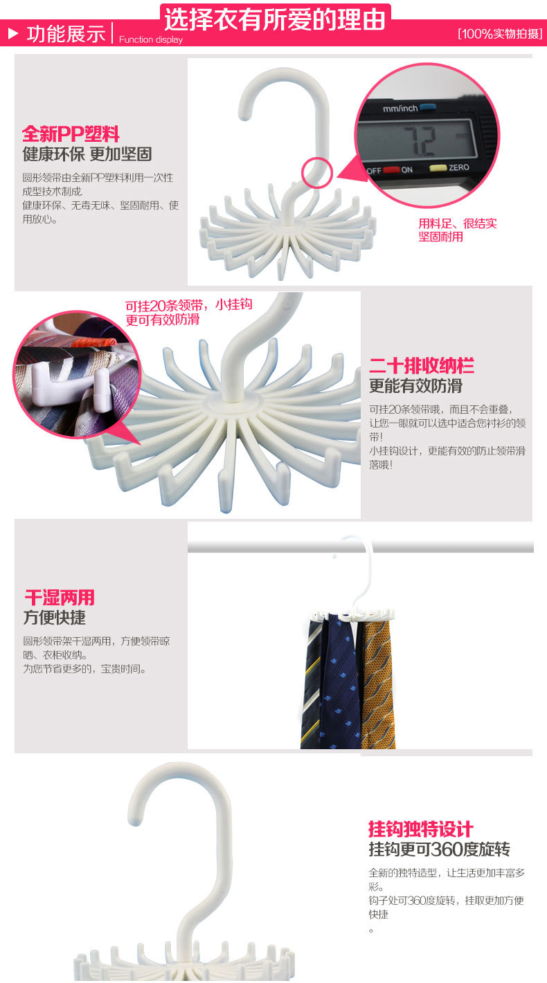 产品特点:多功能魔术领带架,防滑落,防止领带丝巾变形,干湿两用,经久耐用适用衣柜,室内室外。色彩绚丽,独特时尚设计,呵护到位,适用于各种饰品悬挂、展示,时尚大方,经久耐用 。使用环境:-30℃至60℃室内 保养说明:避免长期放置于高温,潮湿环境,如表面有污渍,用干湿布擦拭,即可光亮如新。聚丙烯(PP塑料)是继尼龙之后发展的又一优良树脂品种,它是一种高密度、无侧链、高结晶必的线性聚合物,具有优良的综合性能。未着色时呈白色半透明,蜡状;比聚乙烯轻。透明度也较聚乙烯好,比聚乙烯刚硬。