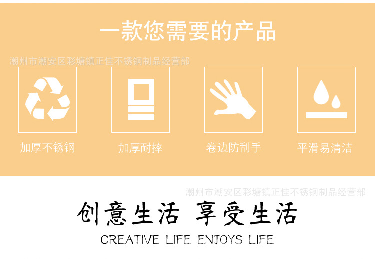 潮安区正佳不锈钢,位于广东省潮安区彩塘镇,地理位置得天独厚、经济发达、交通方便,广梅汕、深厦铁路、高速公路穿越而过,西达揭阳潮汕国际机场,南达汕头国际港口码头,北达潮州市历史文化名城,是名显海内外之侨乡,是聚集美术工艺、高新科技、工商贸易的繁华中心,更是千闻不如一见的工贸、行居、旅游之胜地。 我们以生产不锈钢圆盘、各种锅类为主,不锈钢口杯、密封罐 保鲜罐、各式不锈钢水壶、调料缸、面盆为辅,拥有完整、科学的质量管理体系。 彩塘镇素来有着“不锈钢王国”之称,企业文化底蕴深厚,正佳不锈钢在此背景下积极进取,以严格的管理打造优良的制造品质,以诚信、实力和产品质量获得业界的认可,迅速成为一个杰出的不锈钢商家。 欢迎您与我们联系洽谈,我们热忱期待与您的合作!
