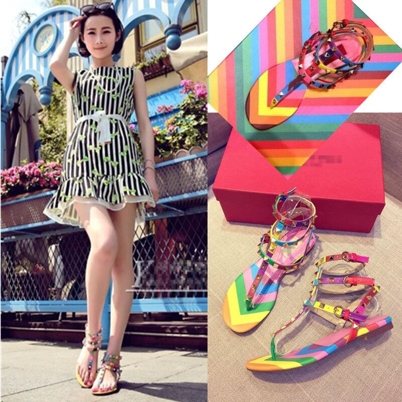 34-45 플러스 사이즈 유럽과 미국 여름 다채로운 색상 일치 플랫 힐 달콤한 발가락 리벳 로마 샌들 T 자형 버클스토어 가기