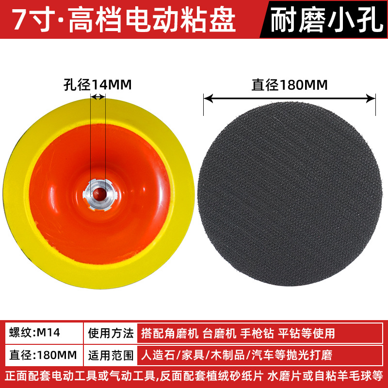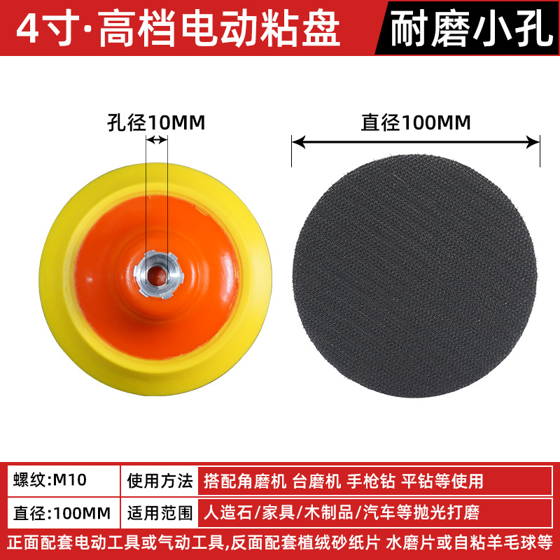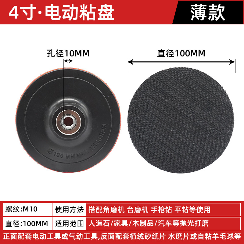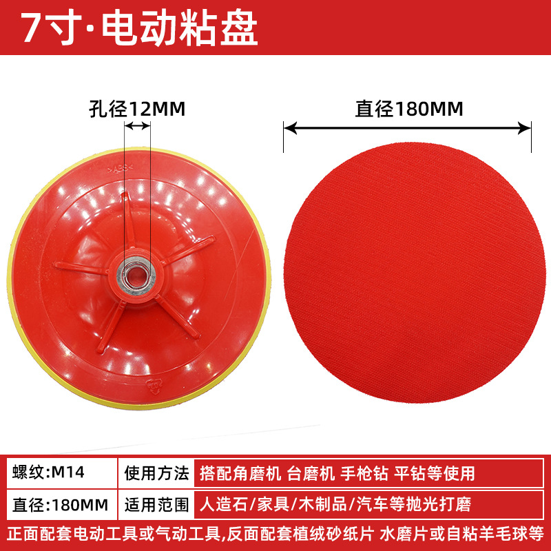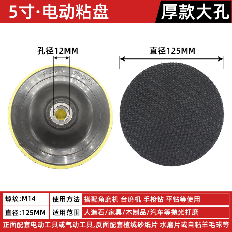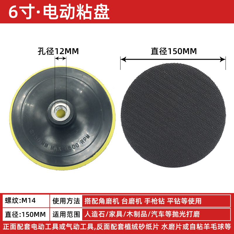 自粘盘和打磨机配套使用,正面有螺纹可以拧上打磨机,反面可粘上植绒砂纸片、水磨片或自粘羊毛球,广泛用于人造石、家具及木制品、金属、汽车等物品的打磨和抛光!电动吸盘详情_01