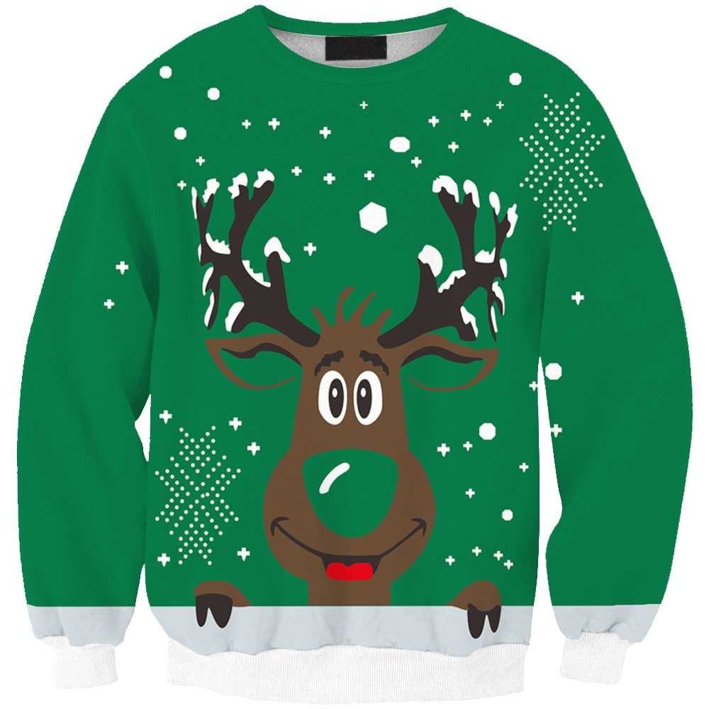 유럽과 미국 디지털 인쇄 크리스마스 녹색 바닥 바느질 귀여운 작은 엘크 풀오버 스웨터 도매 Sws0170스토어 가기