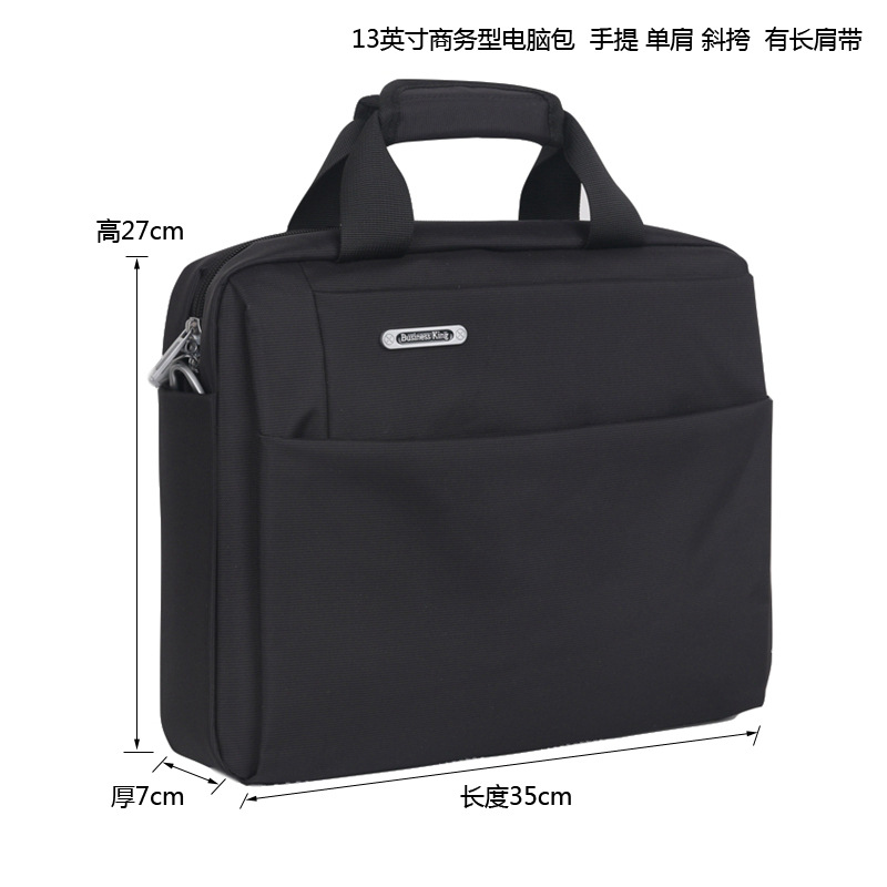 第一层拉链袋:内 敞口袋个,笔插位2个; 副袋:横拉链袋1个; 主袋:拉链袋:13英寸笔记本电脑隔层1个,内拉链暗袋1个; 背面拉链袋1个; 装卸式长肩带1只 |