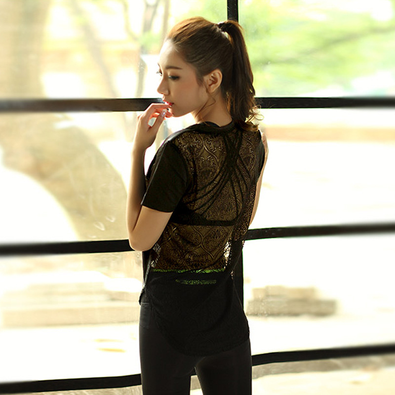 한국 봄과 여름 레이스 요가 피트니스 의류 여성용 속건 느슨한 스포츠 티셔츠 러닝 탑 V-넥 중공 반팔스토어 가기