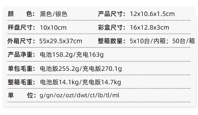 单位:g/gn/oz/ozt/dwt/ct/lb/tl/ml