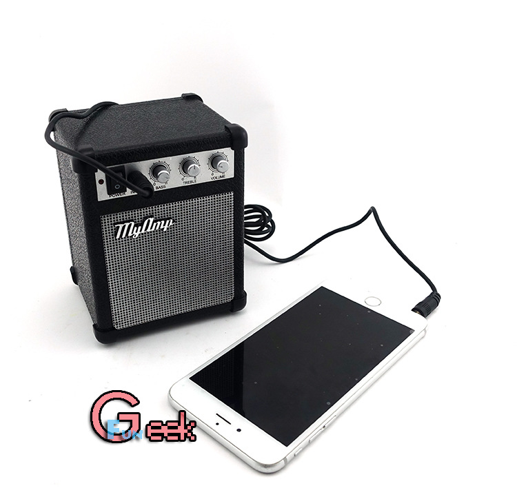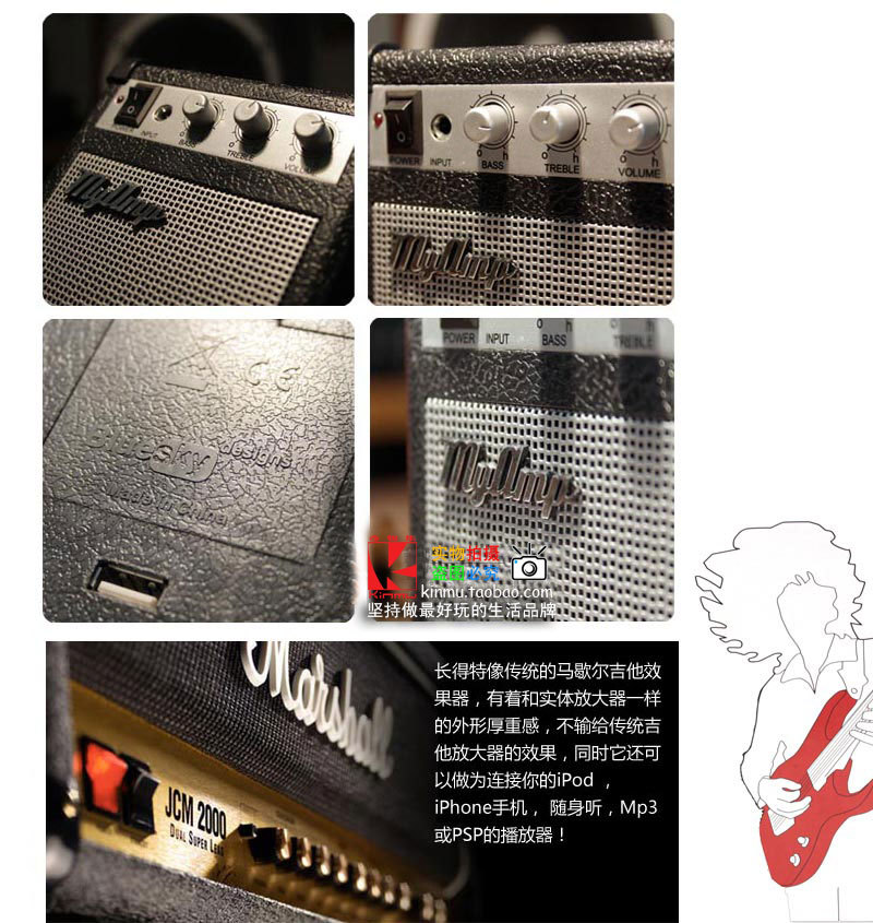就连它的造型也不同寻常,沉重的质感,里面不少金属的材质,这样在低音很猛的时候音箱也不会有太大震动,保证了音效,而样子完全就是一个传统的吉他效果器,有着和实体放大器一样的外形厚重感,不输给传统吉他放大器的效果,同时它还可以做为连接你的iPod , iPhone手机,随身听,Mp3或PSP的播放器。带有标准的3.5mm迷你插孔,仅需电池3节5号电池供电(不包括电池)还可以通过计算机的USB端口输出。