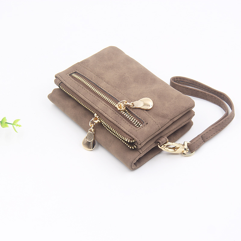 钱包女短款欧美复古PU磨砂五金叶子搭扣拉链折叠多功能学生零钱包