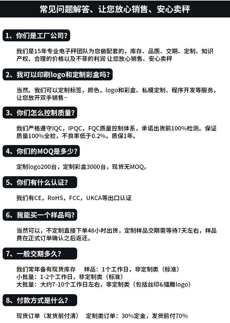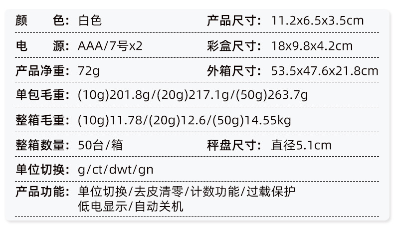 产品功能:单位切换/去皮清零/计数功能/过载保护/低电显示/自动关机