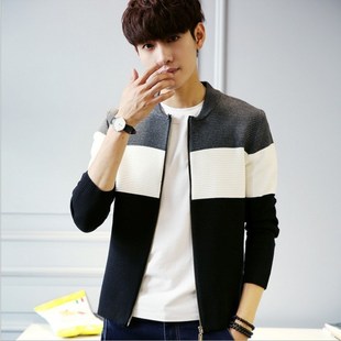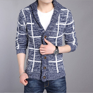 2017秋冬韩版新款男式毛衣时尚修身格子长袖翻领男针织开衫外套