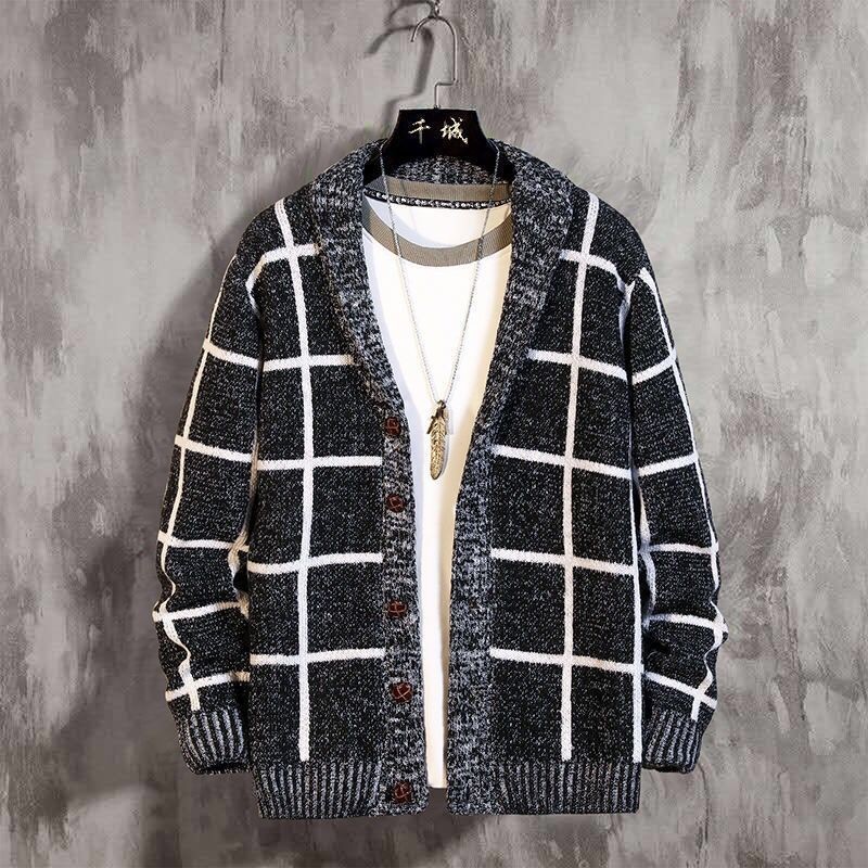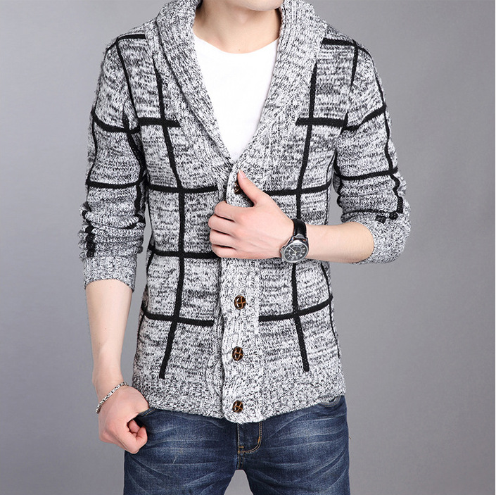 2020 가을과 겨울 한국 스타일 새로운 남성용 스웨터 패션 슬림핏 격자 무늬 긴 소매 옷깃 남성 니트 가디건 재킷