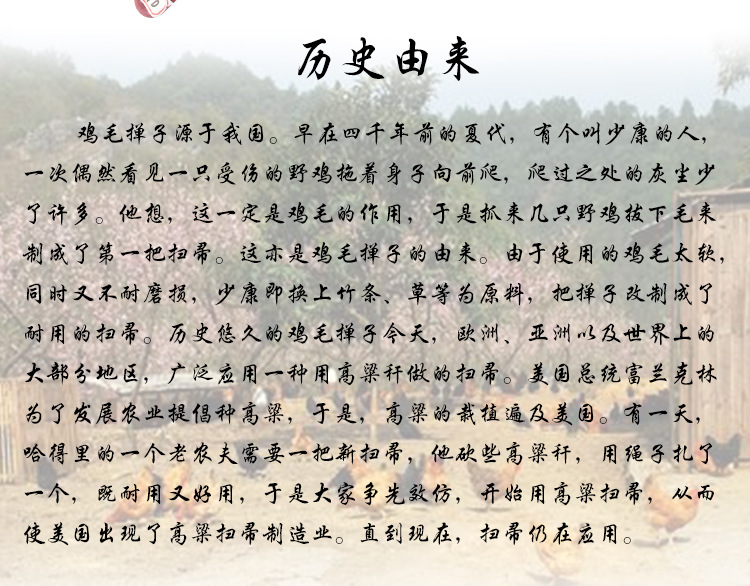 新胜羽毛制品厂(总厂在河南漯河,分厂在广东揭阳市,两地加工生产)是一家集羽毛生产加工、的私营独资企业,鸡毛掸子,鸵鸟毛掸子和火鸡毛掸子及各种羽毛掸子是我厂的主营产品。是一家经国家相关部门批准注册的企业。新胜羽毛制品厂以及时的交货能力、合理的价格、优良的服务与多家企业建立了长期的热诚欢迎各界前来参观、考察、洽谈业务。企业文化为:诚信是企业生存和发展的基础。一个企业规模话的过程一定是企业诚信规模化的过程。诚信是金,欢迎各界朋友前来考察!!!