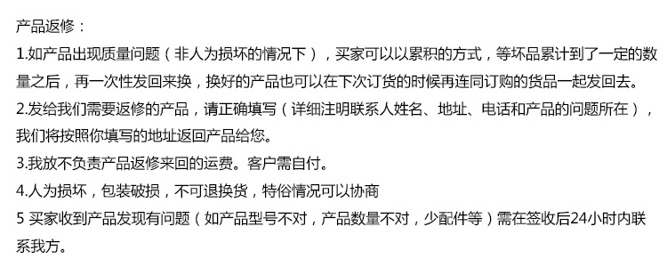 1.如产品出现质量问题(非人为损坏的情况下),买家可以以累积的方式,等坏品累计到了一定的数量之后再一次性发回来换,换好的产品也可以在下次订货的时候再连同订购的货品一起发回去。
