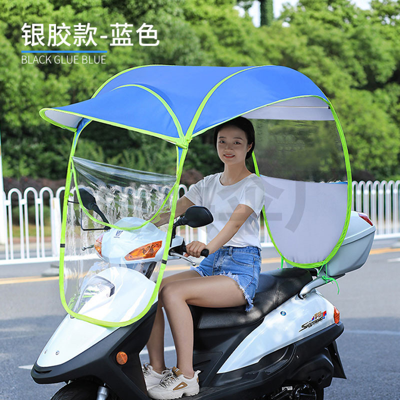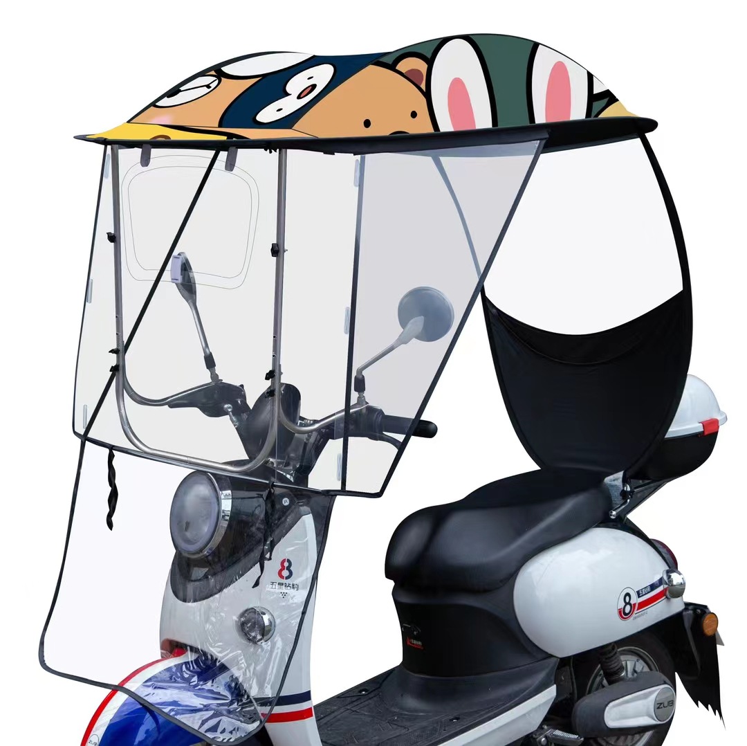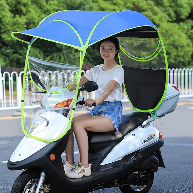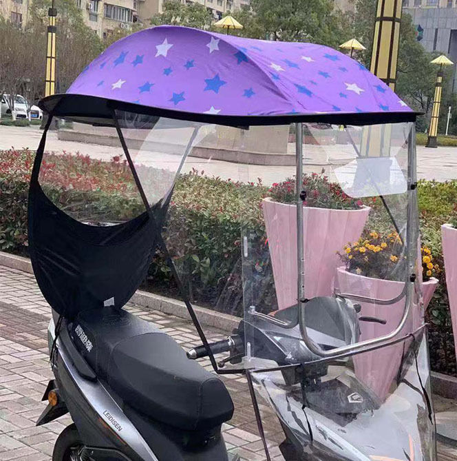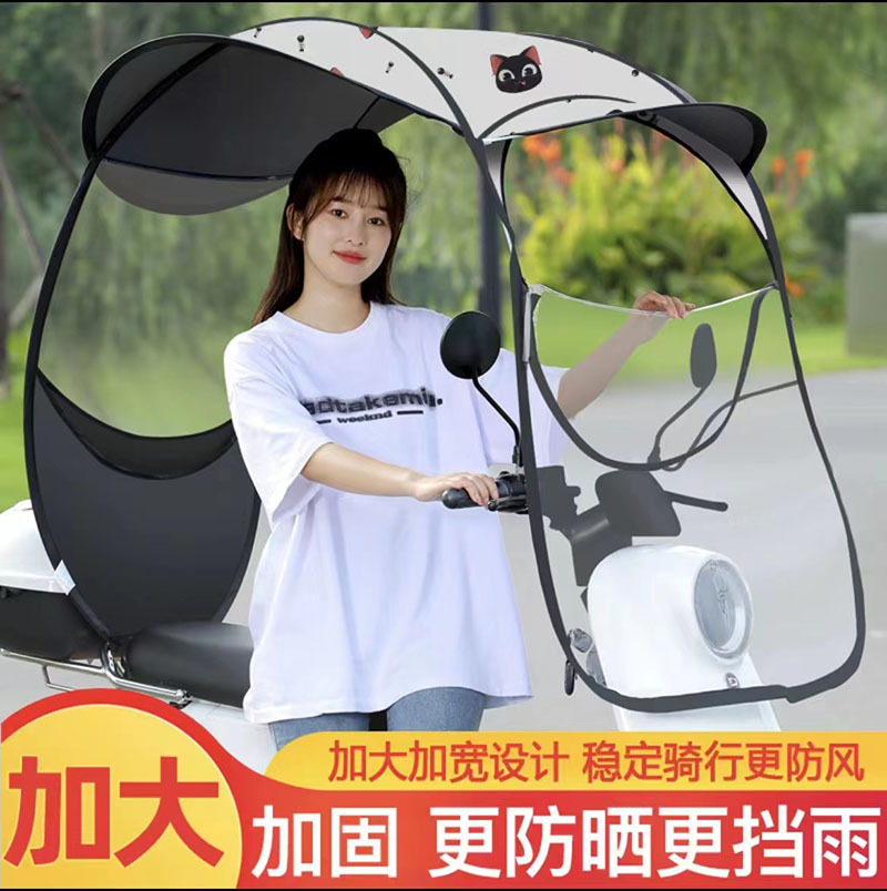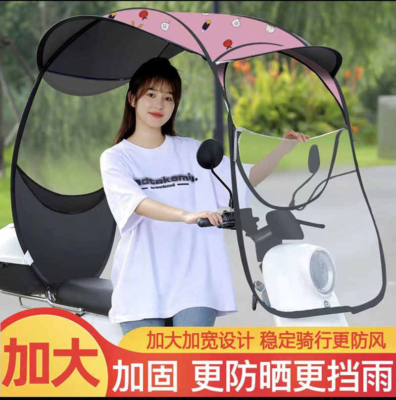 优点:1,加大加宽加长,空间大。2:前面帽檐长且平,解决了夏季阳光直射眼睛,什么也看不到,下雨有效阻止雨水,避免前透明膜沾满水珠看不清,3:铁弯杆加粗,做加速和刮风时起稳定作用。4:前面带拉链,需要时可以打开,减少了阻力