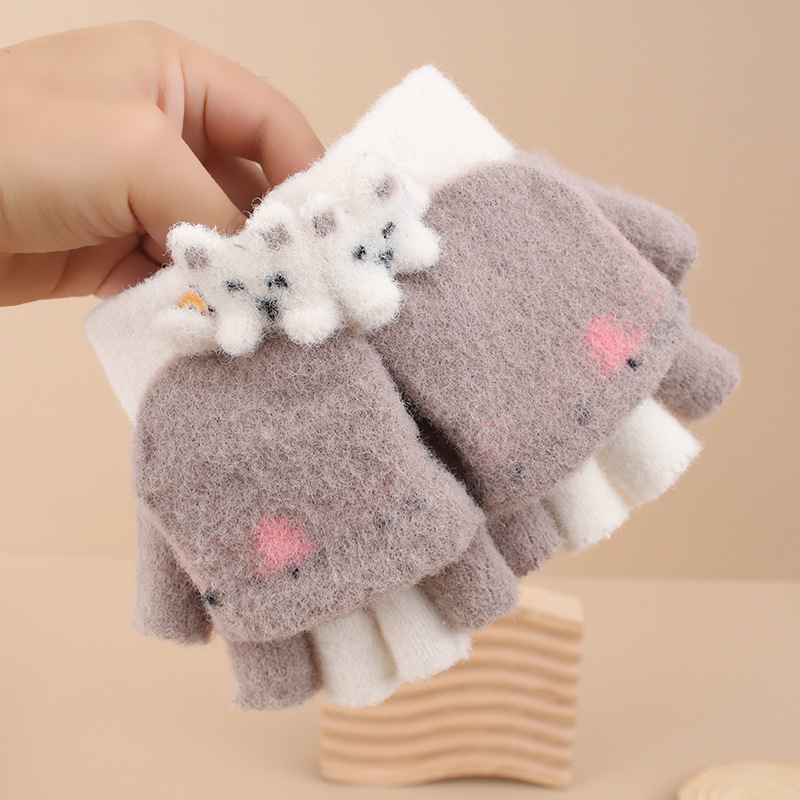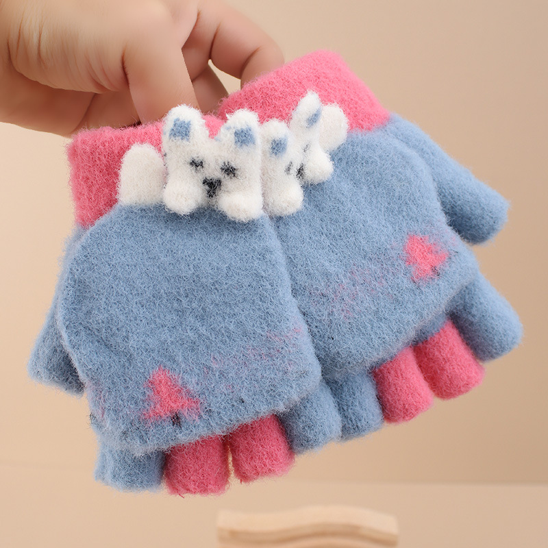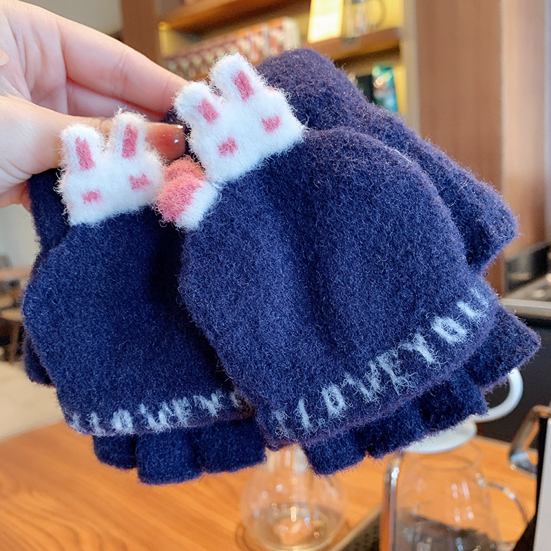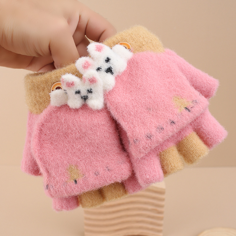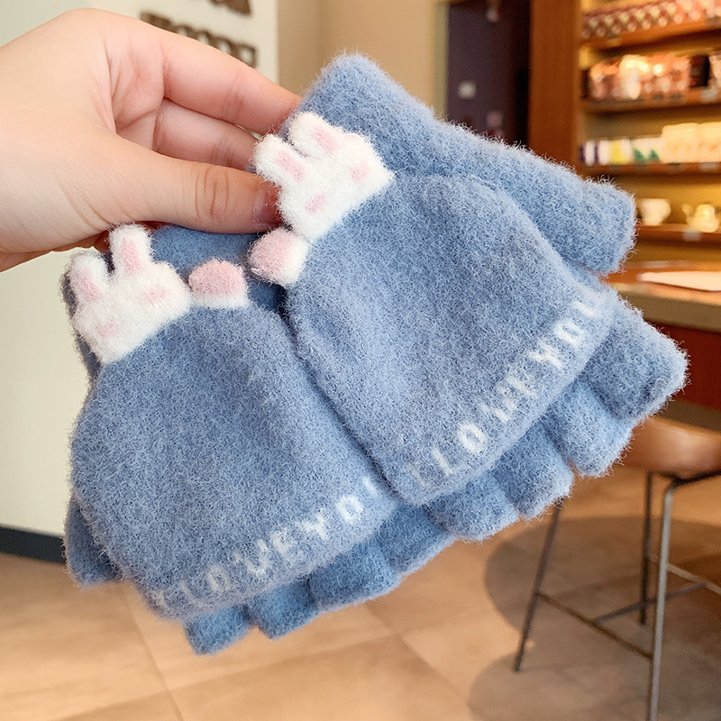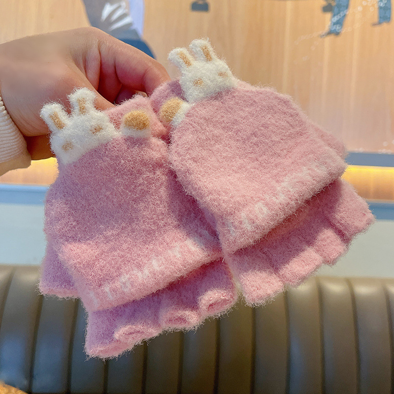 어린이 장갑 겨울 소녀 따뜻한 반 손가락 플립 커버 이중 목적 두꺼운 귀여운 토끼 반 손가락 장갑 소년 및 초등학생 용 장갑