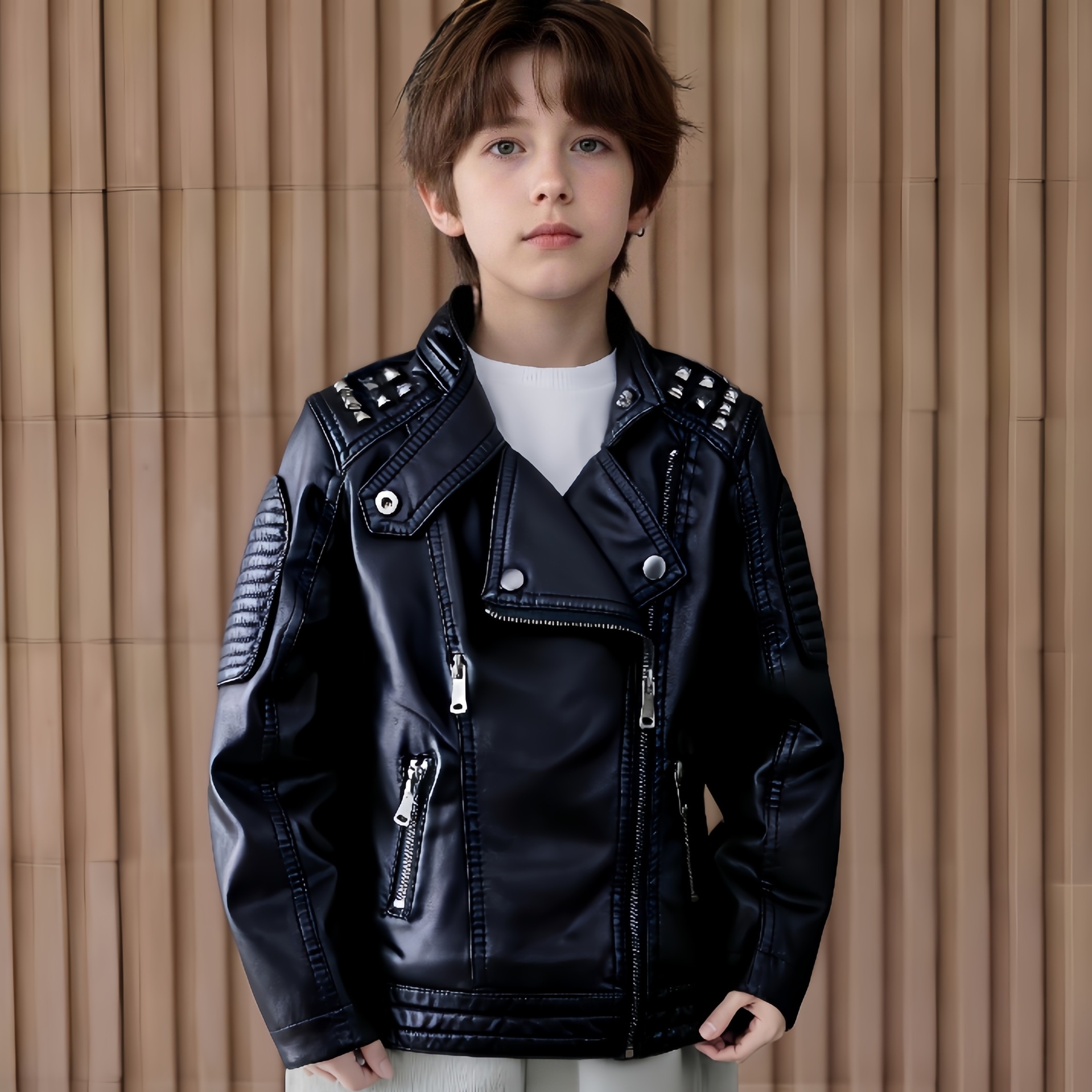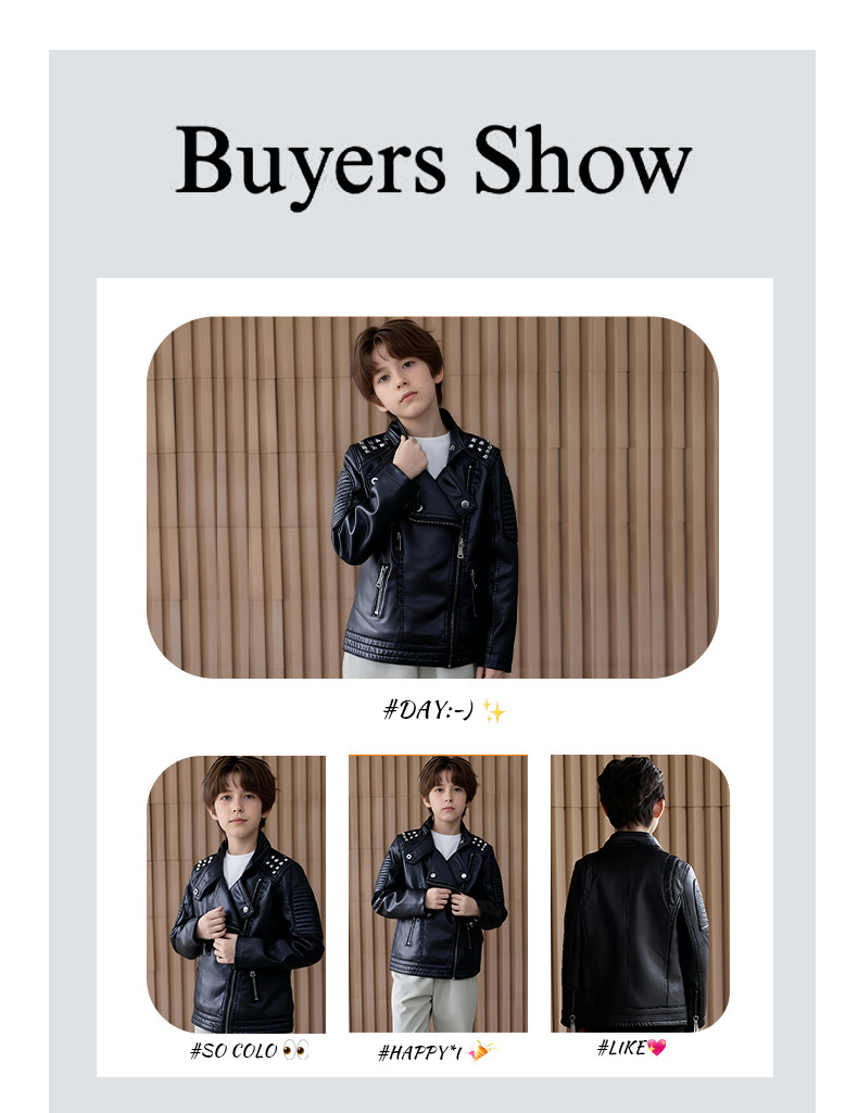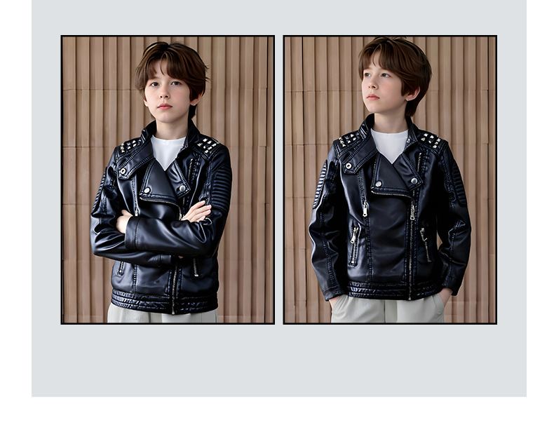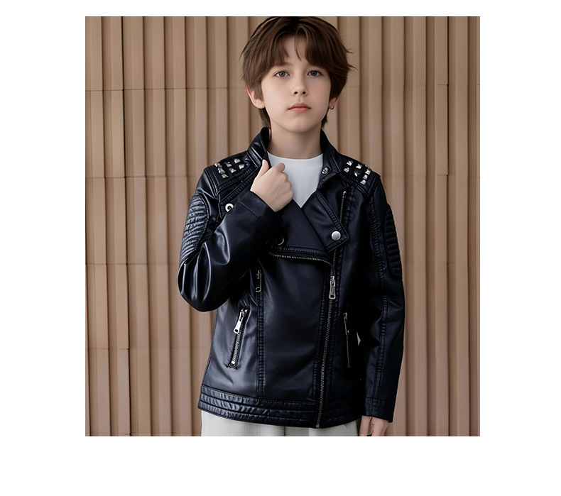 어린이용 가죽 자켓, 리벳 디자인 PU 가죽 자켓, 봄 가을 신상품, 한국 스타일 슬림핏, 해외 무역 인기 상품, 재고 있음, 도매스토어 가기