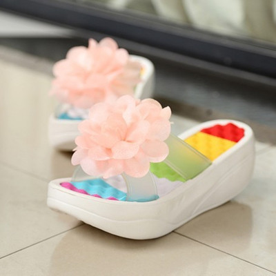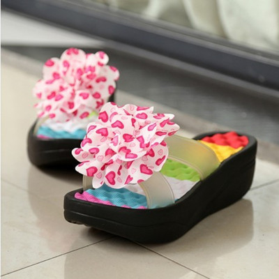 여름 샌들 여성 비치 슬리퍼 두꺼운 밑창 하이힐 꽃 신발 집 외부 슬리퍼 여성 도매