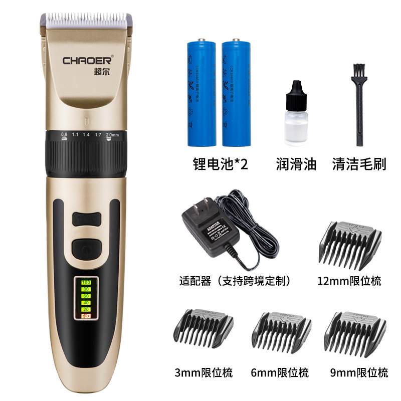 产品配件:包装盒,说明书,4个定位梳,,一个充电器,一瓶润滑油,一只清洁刷,备用锂电池。