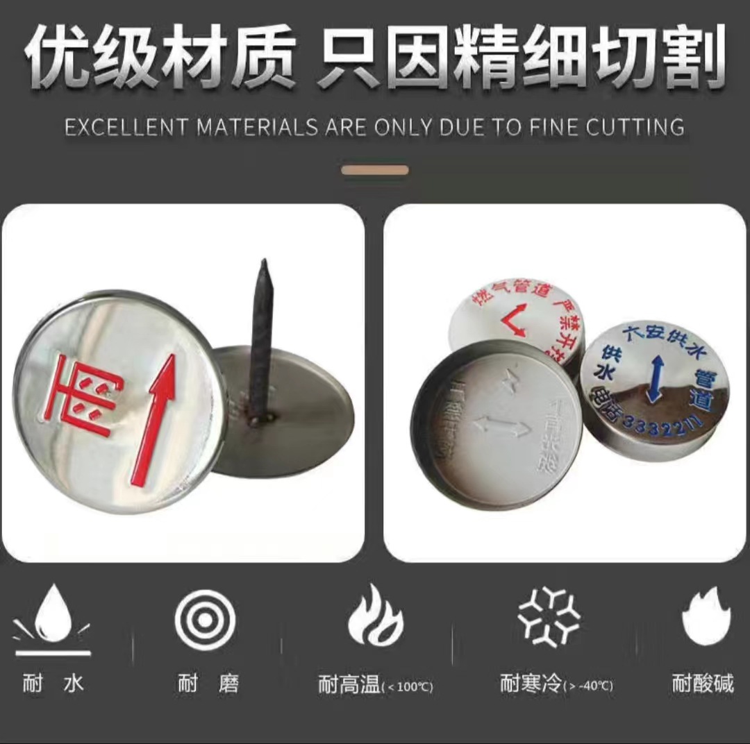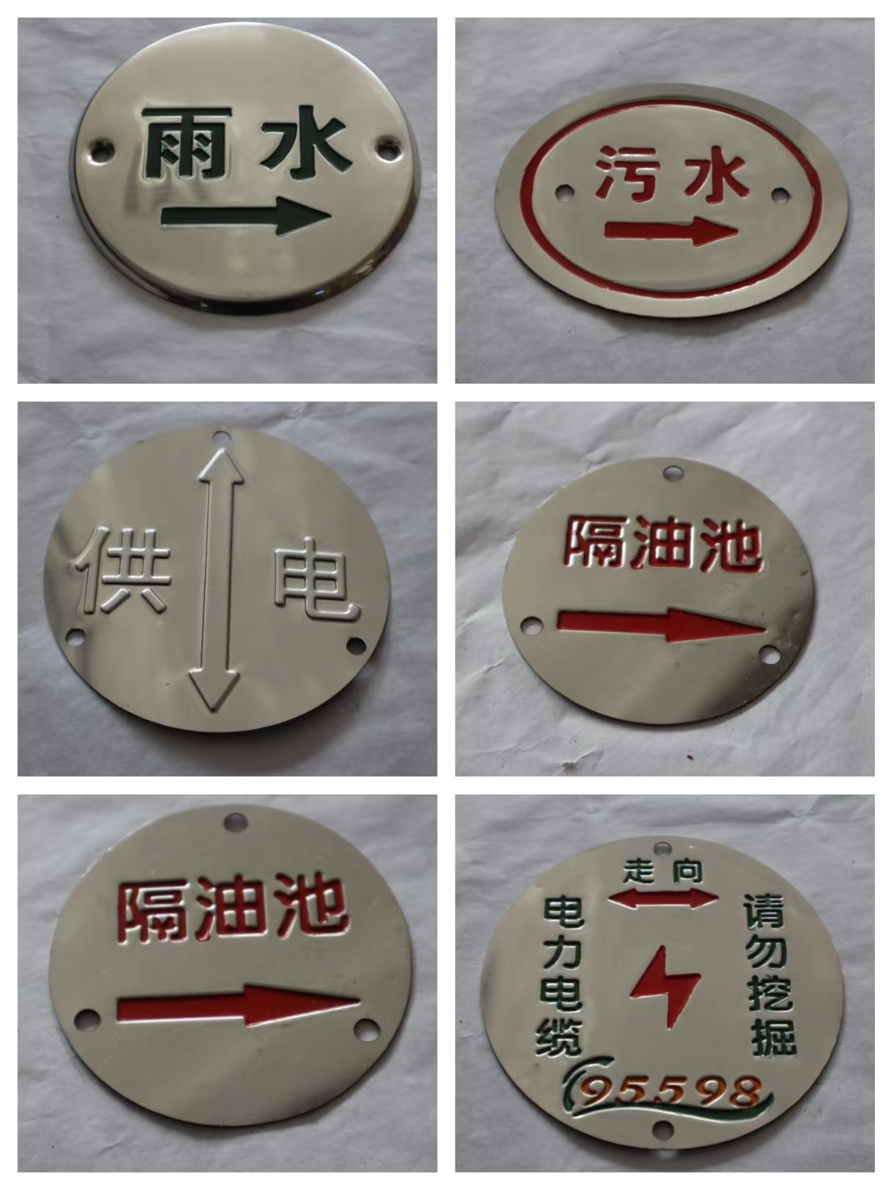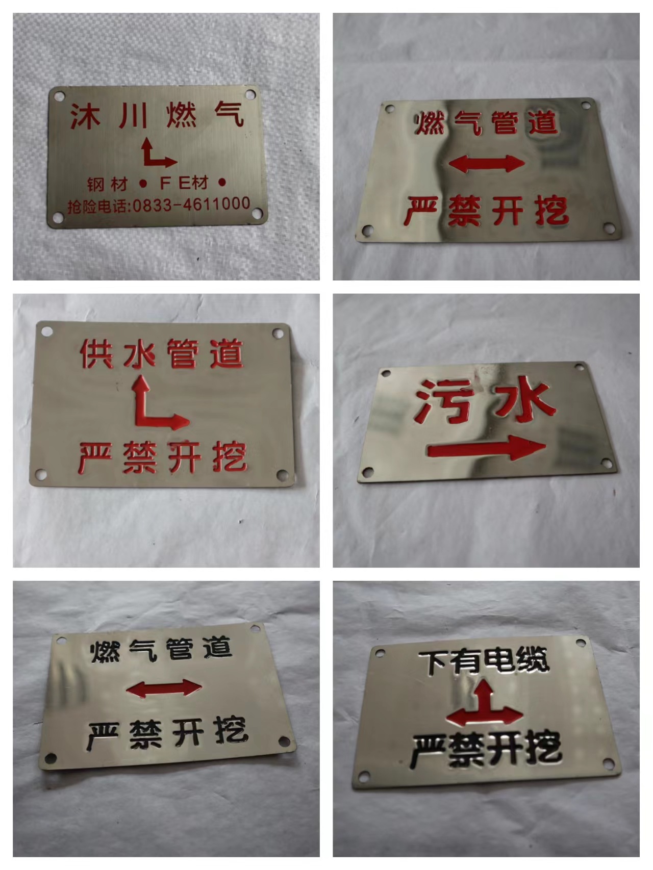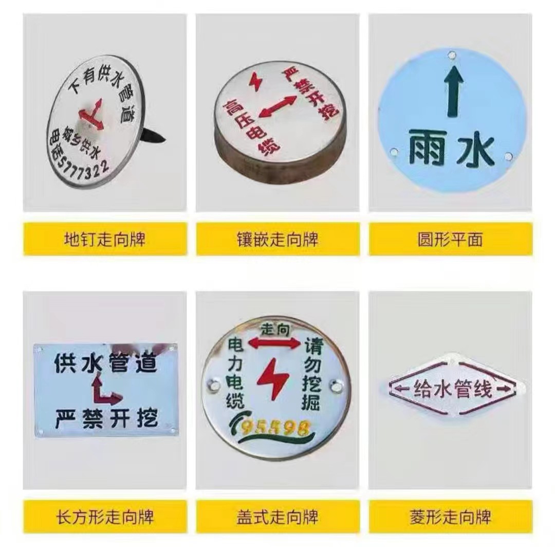 标志内容1:用中文说明此处地下配有何种管线,管线布置方向箭头------表示管线走向,如需要,还可配有官线管理单位电话号码,序号等。二、外观形状及尺寸可按图例选用,也可根据客户需要进行调整。三、按管线布置走向的不同,产品可分为多个品种进行组合。四、标牌材质为不锈钢板文字图案为腐蚀刻制凹凸版字面,防磨、明显、文字可长时间不掉,送货到单位,欢迎广大新老客户咨询洽谈,欢迎新老用户订购