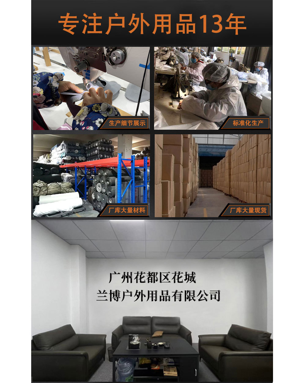 广州市花都区花城兰博户外用品厂是一家集设计、生产、销售于一体的实业公司.本公司主要生产销售:户外背包、战术腰包、战术腰带、战术背心、战术狗包,以及各种医疗包.本公司拥有完整、科学的质量管理体系。自有生产工厂,多名老员工在户外产品领域有着丰富的设计、生产经验,我们秉承服务优质、全面周到,产品质量优,价格低等优势占有市场,在产品的设计、包装、质量上不断的提升,以满足大量新老客户的需求,产品远销海外。专门为国内外贸易公司、实体店、网上店铺(速卖通、EBAY、WISH、亚马逊、天猫,淘宝C店,京东)等店铺供应大量现货。接受来样加工生产,贴牌。