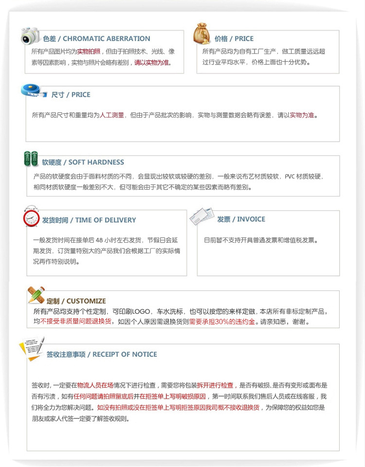 我司对所直接发布的商品信息和客服交流内容进行负责,如发生言行不一致,直接给商户造成损失的,由本店承担。但拒绝承担因客户自身原因造成的损失(如不看产品详情、产品属性,例如产品大小和想象不一样等)希望客户能多看多问。