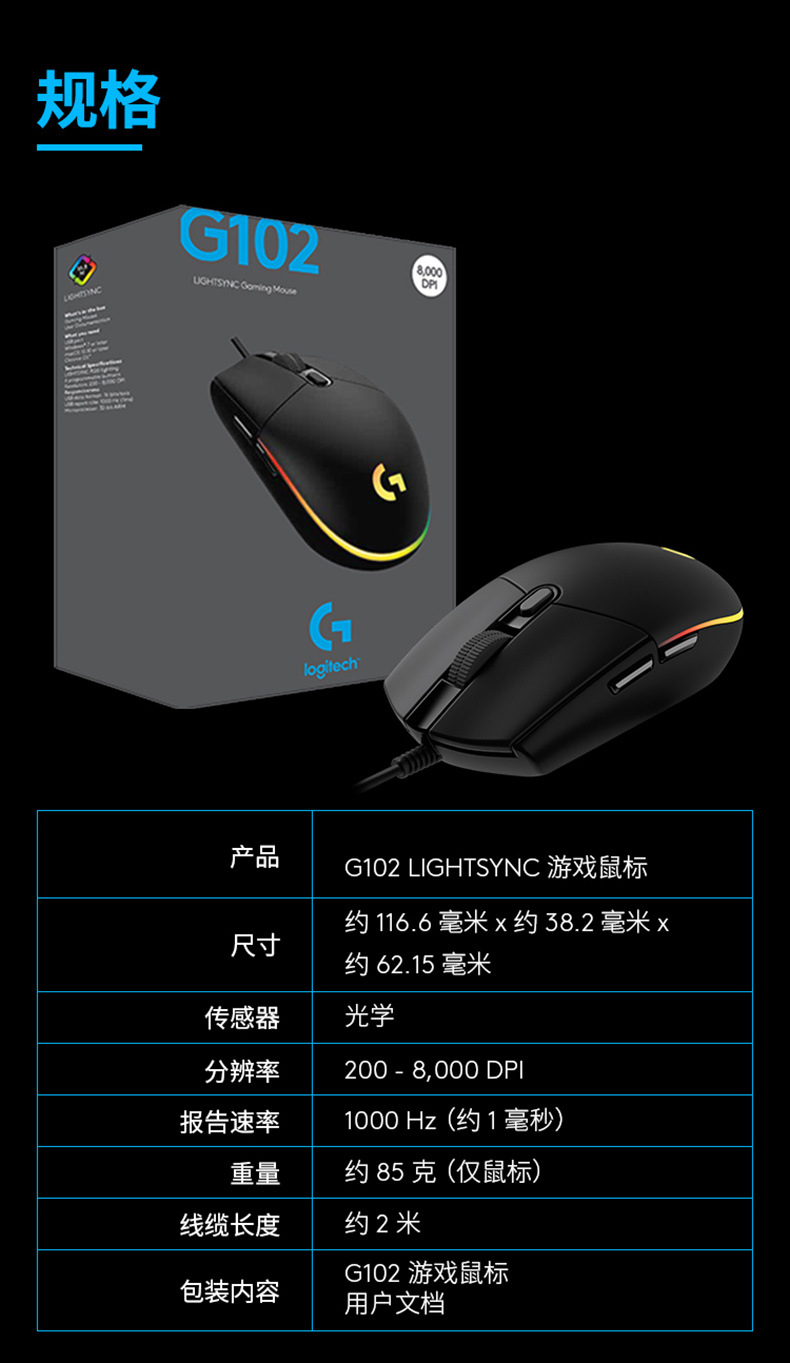 로지텍 G102 2세대 유선 게이밍 마우스 e스포츠 맥로 기능 LOL 경쟁용 RGB 라이트스토어 가기