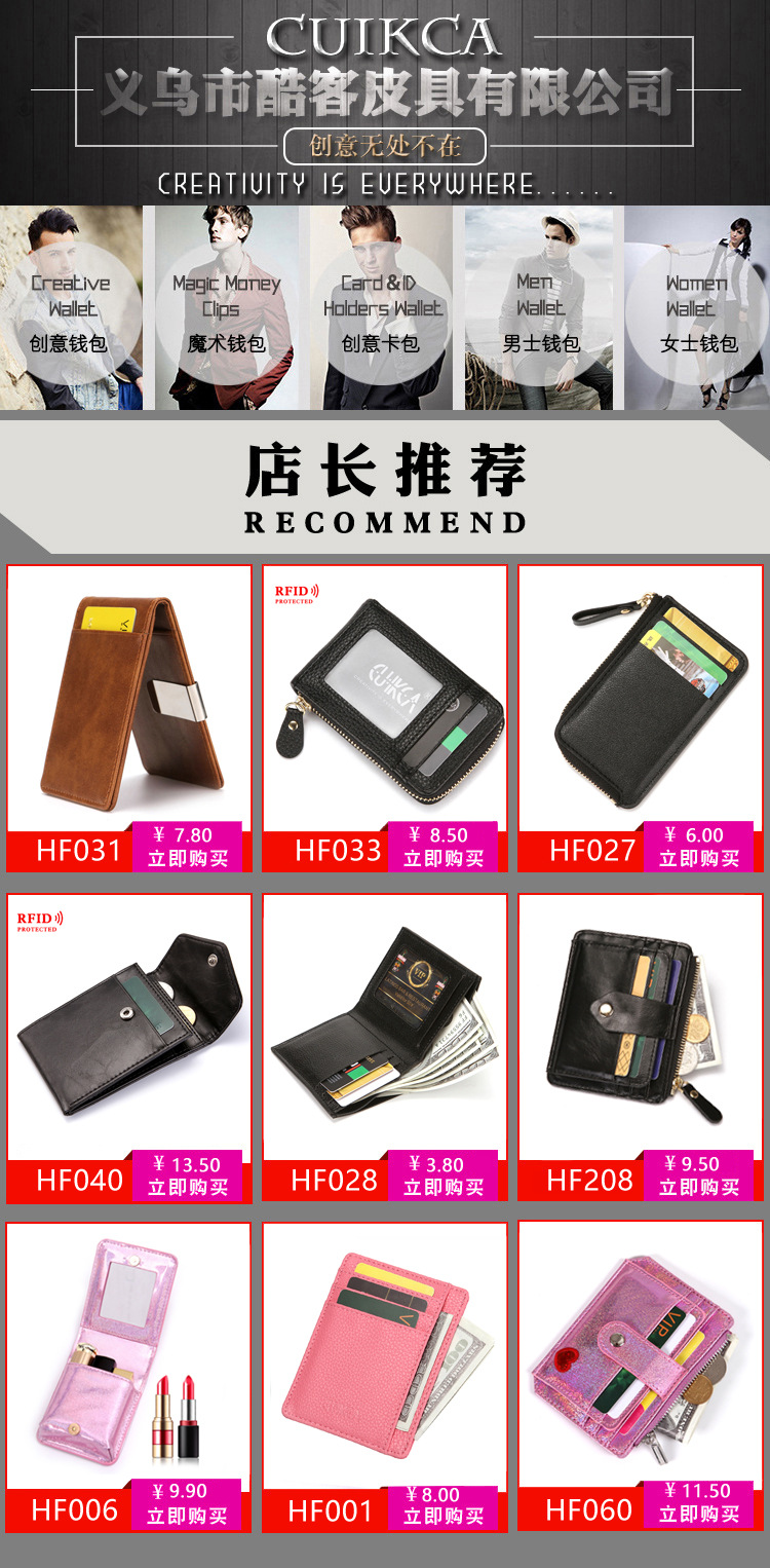 酷客皮具有限公司:坐落在中国小商品之都——义乌,专门从事皮具生产加工,经销。本公司自己独立品牌“CUIKCA”,是一家以强大传统市场依托的专业生产加工公司。公司以全新的经营理念将传统与网络结合,为顾客提供多元化购物渠道。 公司主要经营时尚创意钱包、魔术钱包、创意卡包、男女时尚钱包,产品种类多、规格全、产量大、货源足、款式新颖,充分满足了社会各界人士居家、旅游、休闲、交际之需,因而乃至世界各地,深受广大用户的青睐。本公司结合多年国内外传统销售的经验,新开发一些当下流行款式的钱包,产品规格齐全,造型美观,款式新颖,特别是质量长期达优,深得国内外客户的高度赞誉和信赖。产品销路非但在国内市场上,而且远销西欧、东南亚、日本、美国,中东、等世界各地。 公司秉承“创意无处不在”的设计理念,以诚实、守信为原则,用户满意为宗旨,坚持“客户”的原则为广大客户提供、便捷的服务。欢迎各位前来选购!