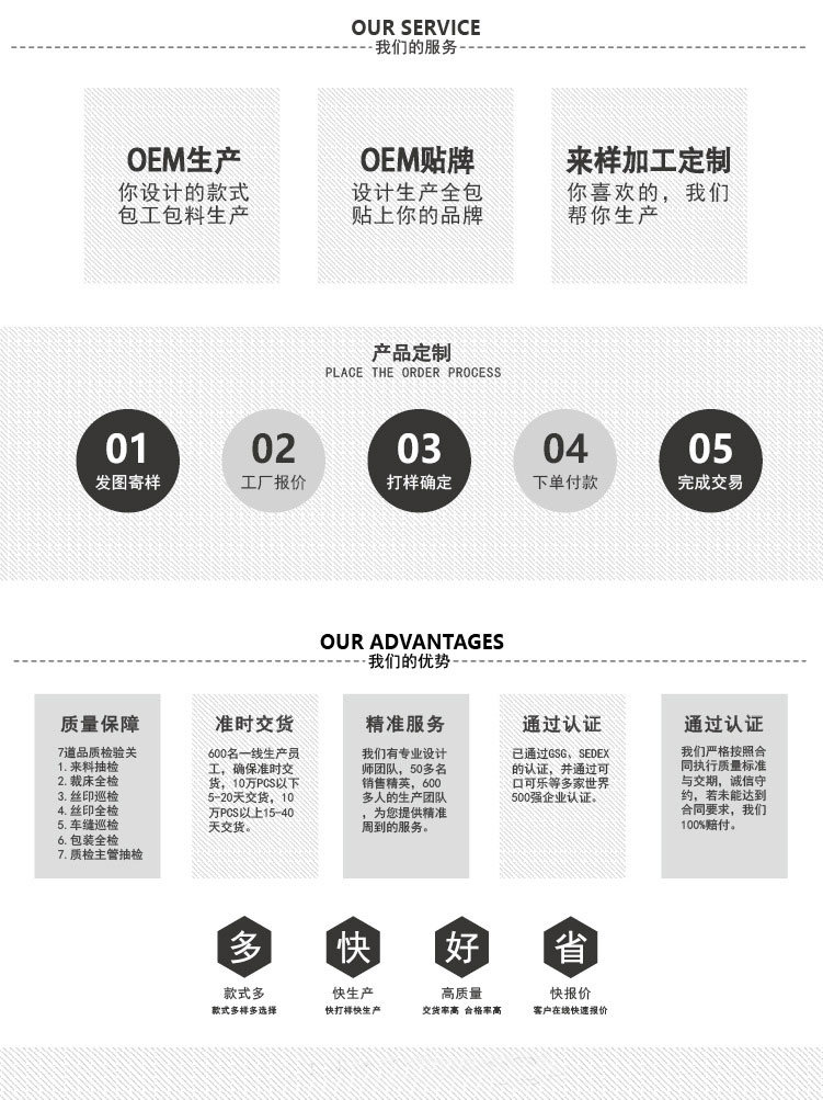 广州市森荣手袋智造有限责任公司是一家具有16年生产经验的工厂,专业生产化妆包、洗漱包、保温包、运动休闲包、拉杆箱套、旅行整理包、妈咪包、购物袋、家居生活包等。目前拥有员工600人,厂房面积26000平方米,月生产包袋数量高达400万个,企业已通过SGS、SEDEX验厂,并先后通过了多家世界500强的验厂认证,公司是2010年中央一套上榜企业,荣誉参展企业,2011年全球十佳网商。