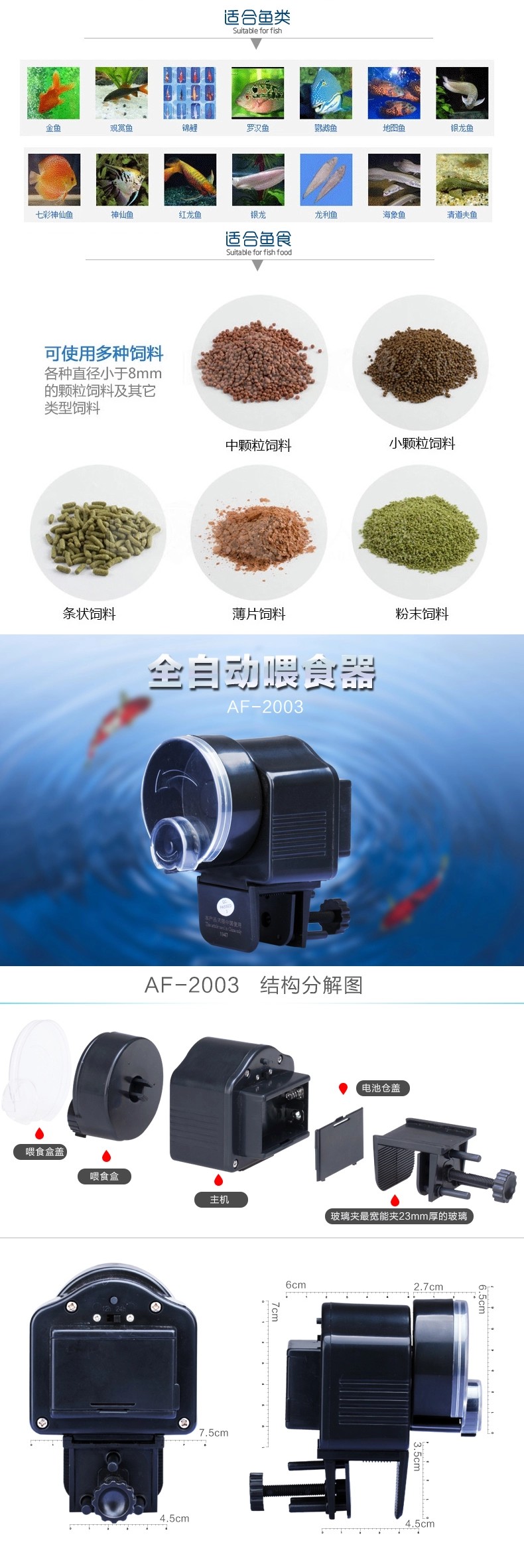 本品仅适用于小颗粒状鱼粮,小型家用鱼缸使用,不适用于片状鱼粮或大型鱼池鱼缸使用。