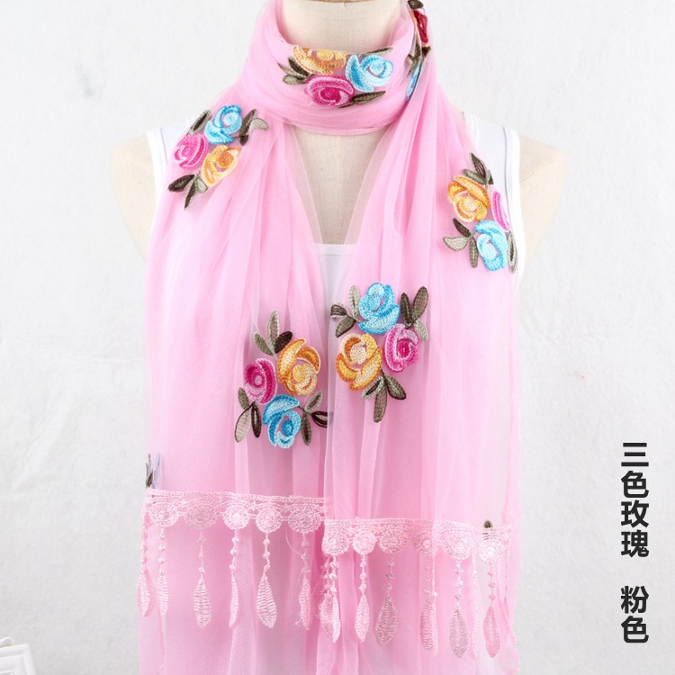双层蕾丝和纱面的拼接,设计感很足,改变了整条丝巾的整体格局,