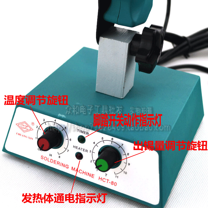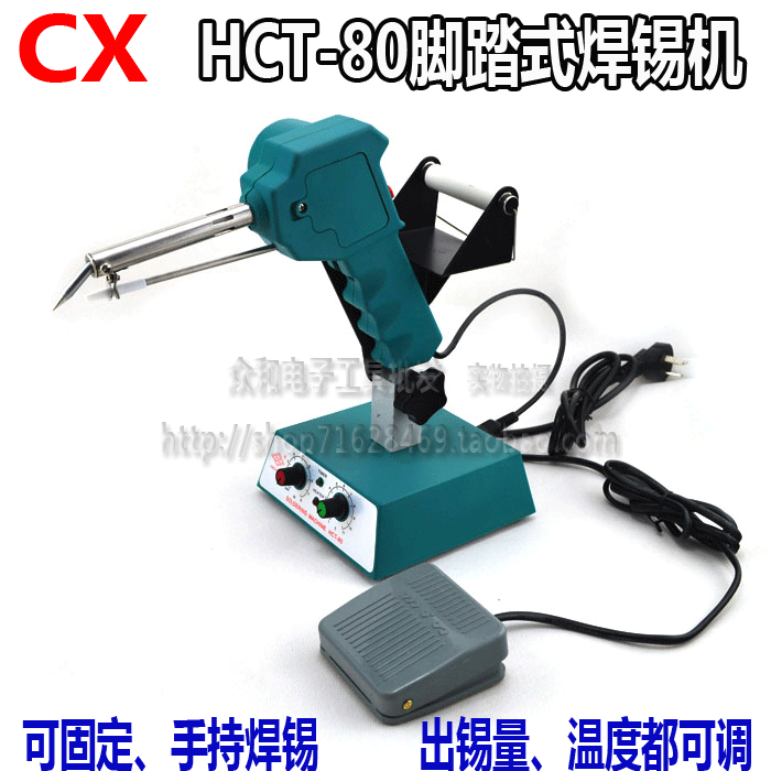 HCT-80脚踏式自动焊锡机优点是烙铁及焊锡均不需假作业员之手,只要轻踩脚踏开关,焊锡会自动地、定量的伸展于与烙铁头下方,您可以一只手拿被焊物,一只手拿镊子、钳子等,只要被焊物直接触及烙铁头,即可轻松完成焊锡作业。因此您可以省下两只手,也就是说本来需要两个人作业的工作,现在一个人就能搞定了。