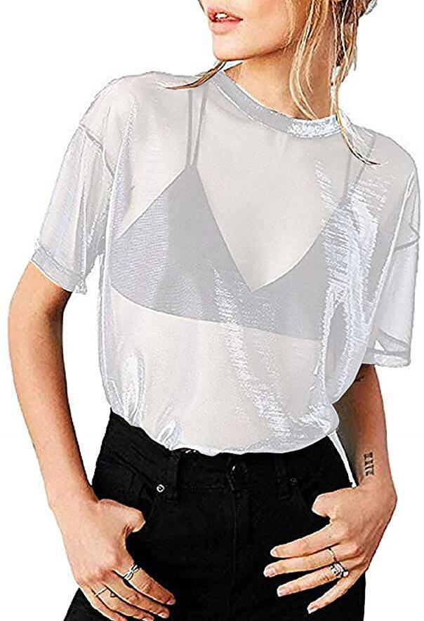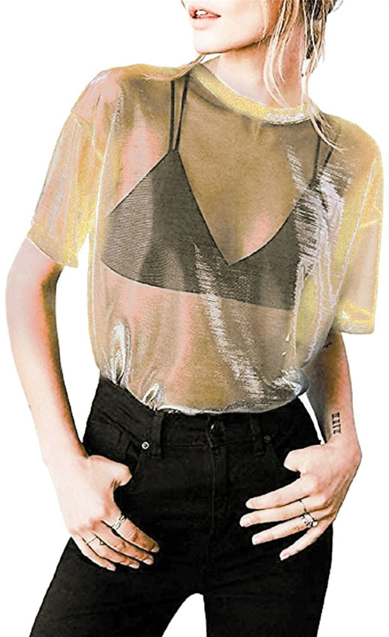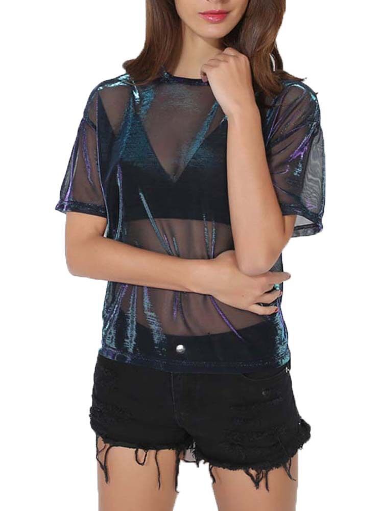 8 색 좋은 품질 유럽 역 레이저 메쉬 반팔 티셔츠 캐주얼 원근법 최고 여성의 관점