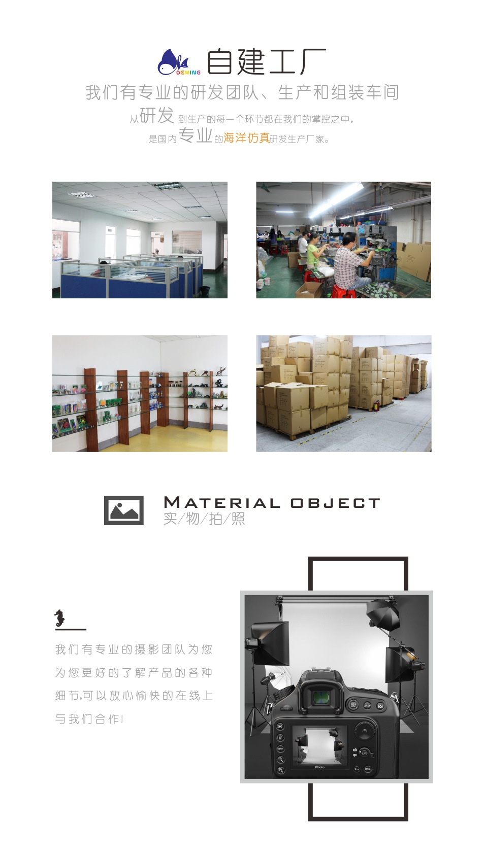 德明水族器材厂成立于2013年,专业于水族装饰产品的开发设计与生产,德明公司为水族爱好者提供更多的选择与惊喜。本公司产品着重自然生物与生态的高度仿真,为业界之翘楚。所有生产材料完全通过欧美各国环保标准。依照不同产品的特性采用不同的高端材料,使其显现真是生物的原始特性。几年来本公司产品为市场接受与极力推崇,不仅是中国本地市场,更多欧洲