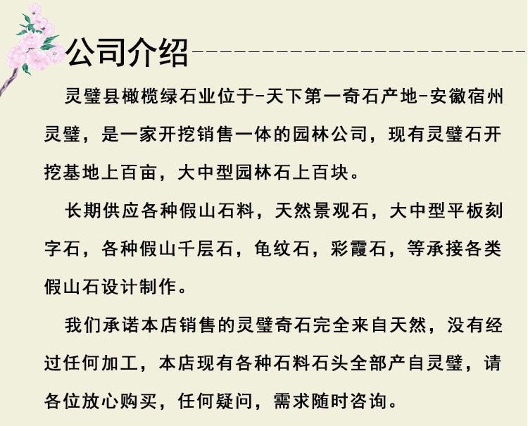 灵璧三宝: 灵璧三绝——灵璧石、钟馗画、虞姬墓 “灵璧一石天下奇,声如青铜色碧玉”。产于安徽省灵璧县境内的灵璧石,其妙趣天成的诱人魅力在于它集声、形、质、色、纹诸美于一体,有着无比丰富的美学内涵和极高的观赏收藏价值。唐宋时期即被奉为贡石,清乾隆帝御封其为“天下第一石”;我国第一颗人造卫星上天时播放的《东方红》乐曲,即为灵璧石制成的乐器演奏。自上世纪九十年代中期以来,历史悠久的灵璧石收藏迎来了新一轮高潮。 灵城城东十五里,与泗县接界外有虞姬墓,至今墓碑尚存,额刻“巾帼千秋”四字。墓园内有碑廊、墓地和陈列馆,在墓园里零散摆着一些汉代、唐、宋的石雕。“虞兮奈何,自古红颜多薄命;姬耶安在,独留青冢向黄昏”,墓前石碑刻的这副对联,似在向人讲述着这个千古悲风的故事。虞姬墓几经整修,扩其旧制,增设新观,已成为环境幽美、声播遐迩的名胜景点。无数中外名人、游客仰姬高风,纷至沓来,吊祭英灵。 灵璧钟馗画又称灵璧判子,它有别于其它地方木板年画或门神画作品,用手工绘画形式,有其独特的民间风味,历经宋、明、清各代,迄今经久不衰,尤甚在清代的灵璧古城内,画店林立,画商如云。为了弘扬传统文化,灵璧县先后成立了“灵璧钟馗画研究会”、“灵璧钟馗画院”等学术团体,并有钟馗画府、钟馗画阁、钟馗画苑等20多家专营画店相继开业,有力推动了灵璧钟馗画业的发展。 灵璧县橄榄绿石业 经销批发的奇石、假山、工艺石、刻字石、石料\\灵璧石位于中国安徽灵璧,是一家集灵璧石、景观石、刻字石、园林石[千层石产地、青千层石,青色千层石,黄千层石,龟纹石产地,青灰色龟纹石,黄色龟纹石]、草坪石、假山石、假山工程承包(千层石假山、龟纹石假山、灵璧石假山)、畅销消费者市场,在消费者当中享有较高的地位,公司与多家零售商和代理商建立了长期稳定的合作关系。灵璧县橄榄绿石业经销的奇石、假山、工艺石、刻字石、石料品种齐全、价格合理。灵璧县橄榄绿石业实力雄厚,重信用、守合同、保证产品质量,以多品种经营特色和薄利多销的原则,赢得了广大客户的信任。 “原创设计、展现艺术、品质优良,打造中国特色的家居饰品系列”是公司的宗旨。富有激情的设计师群体思维敏捷、大胆创新;艺术功底深厚的工匠手艺精湛;他们用年轻的思维解读传统文化,将华夏的艺术发扬光大。