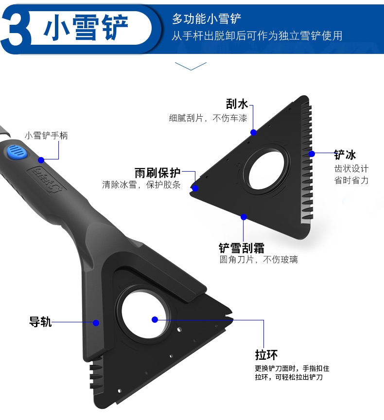 特点:可拆卸使用 功能:铲雪刮霜、铲冰、刮水、雨刷保护、可拆分使用