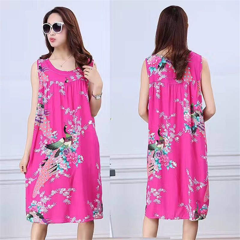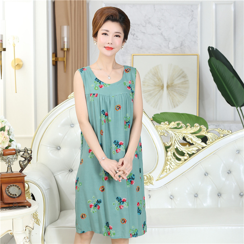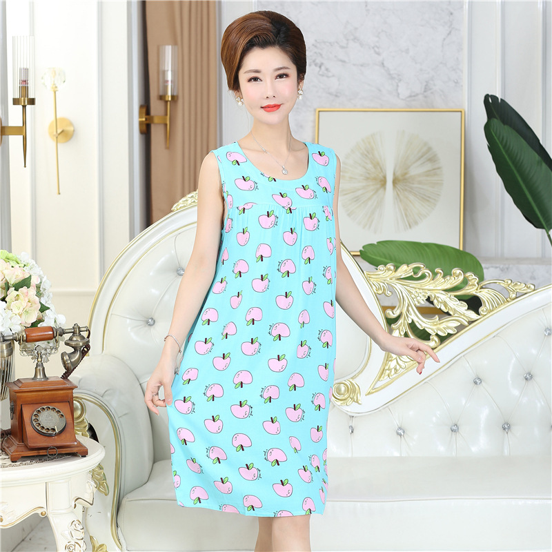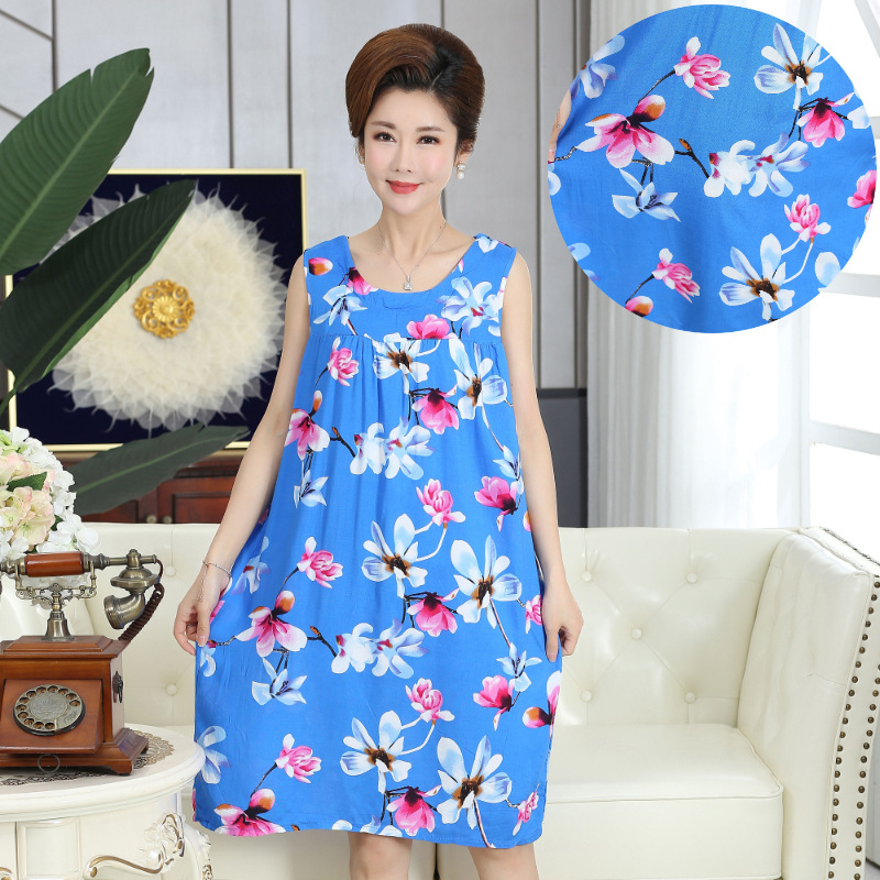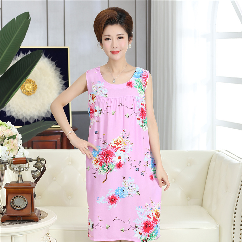 중년 및 노인 여성을위한 여름 잠옷 순수 코튼 실크 어머니의 잠옷 여름 성인 대형 코튼 실크 드레스