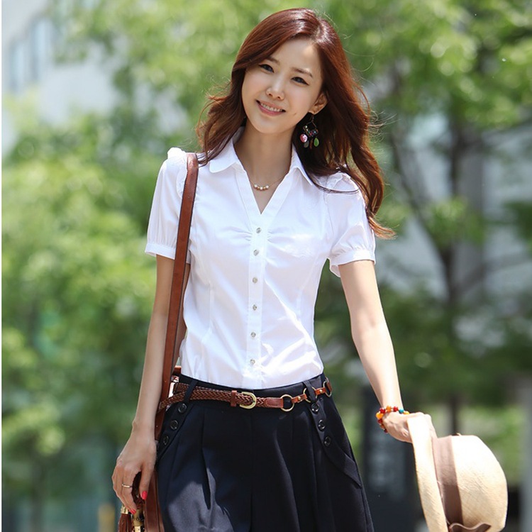 여름 흰색 반팔 여성용 셔츠 한국식 브이넥 프로페셔널 여성용 셔츠 쉬폰 셔츠 슬림핏 플러스 사이즈 여성스토어 가기
