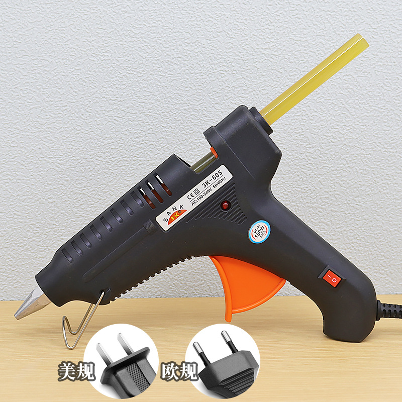 2.将胶条从胶枪尾插入,送至枪管内,插上电源预热1分钟后,扣动板机即能挤出熔胶,并且可控制出胶量。