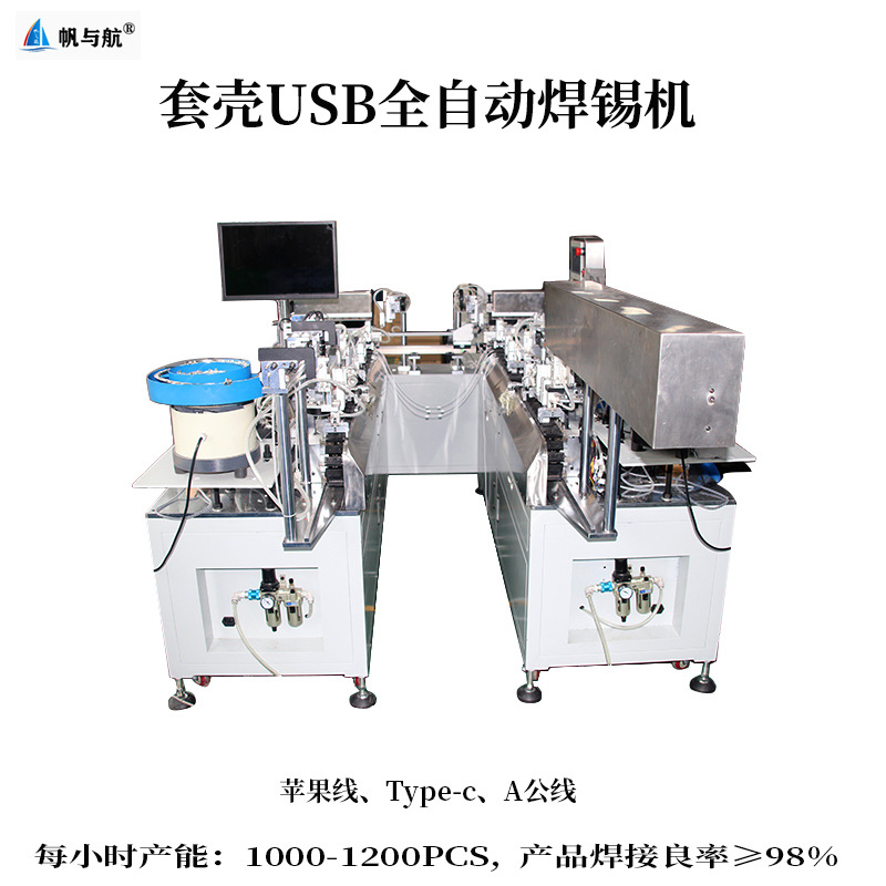 套壳USB全自动焊锡机主要用苹果线,A公、TYPE-C头与线材进行套壳焊锡。