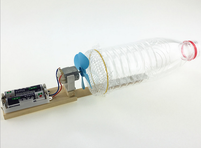 操作指南:仔细调节电机和扇叶的位置,使得扇叶在瓶子的正中心,旋转时不碰触瓶子侧壁的任何位置,然后固定。如果有家长或老师在组装完成后,发现不抽风而是往外吹风的情况,那就是电机接线接反了,把两个线头换一下位置接就好了(这是电机的正反转原理)。