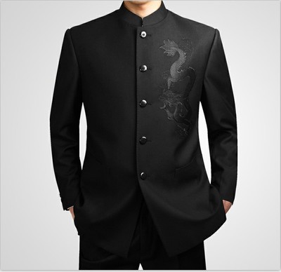 중국어 스탠드 칼라 블랙 세트 세트 수 놓은 용 중산 세트 남자의 작업 전문 정장 원피스 결혼식 최고의 남자 원피스스토어 가기