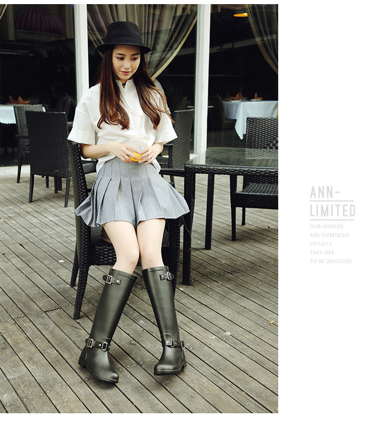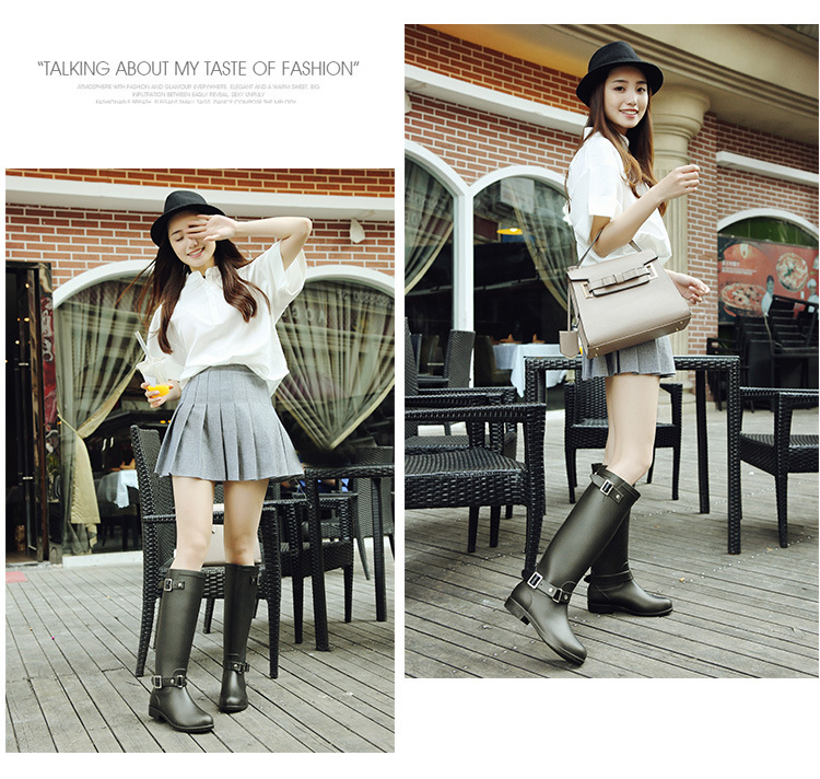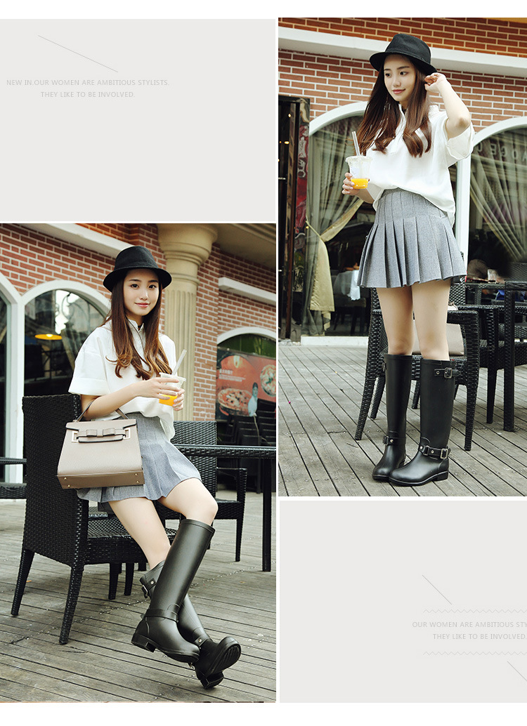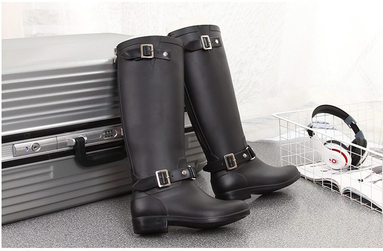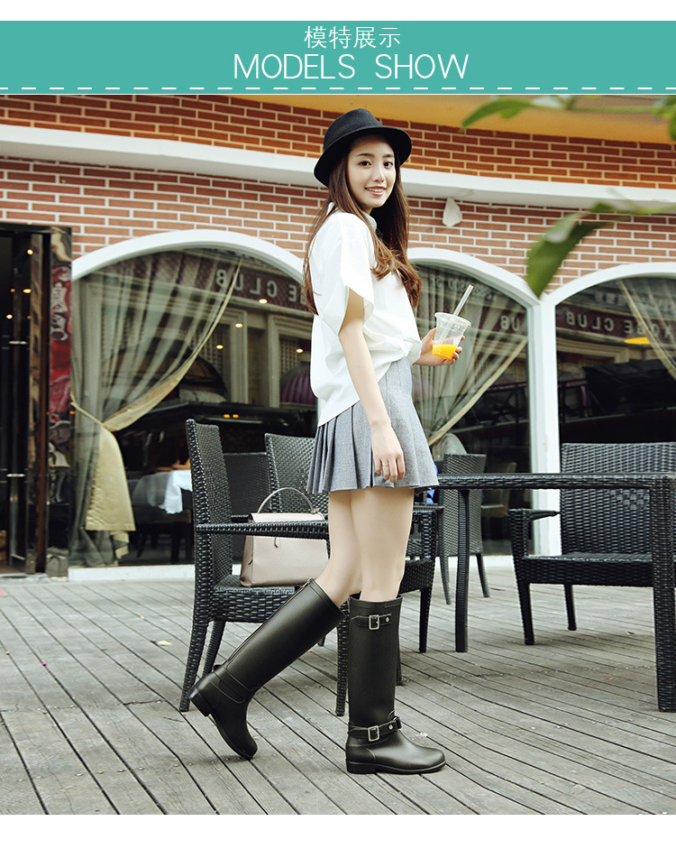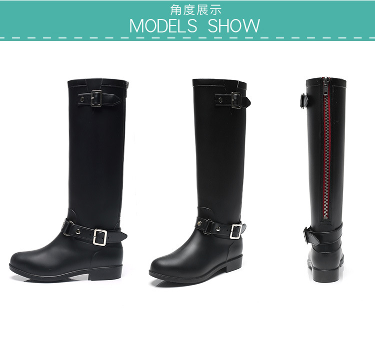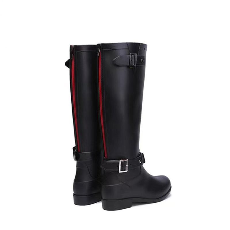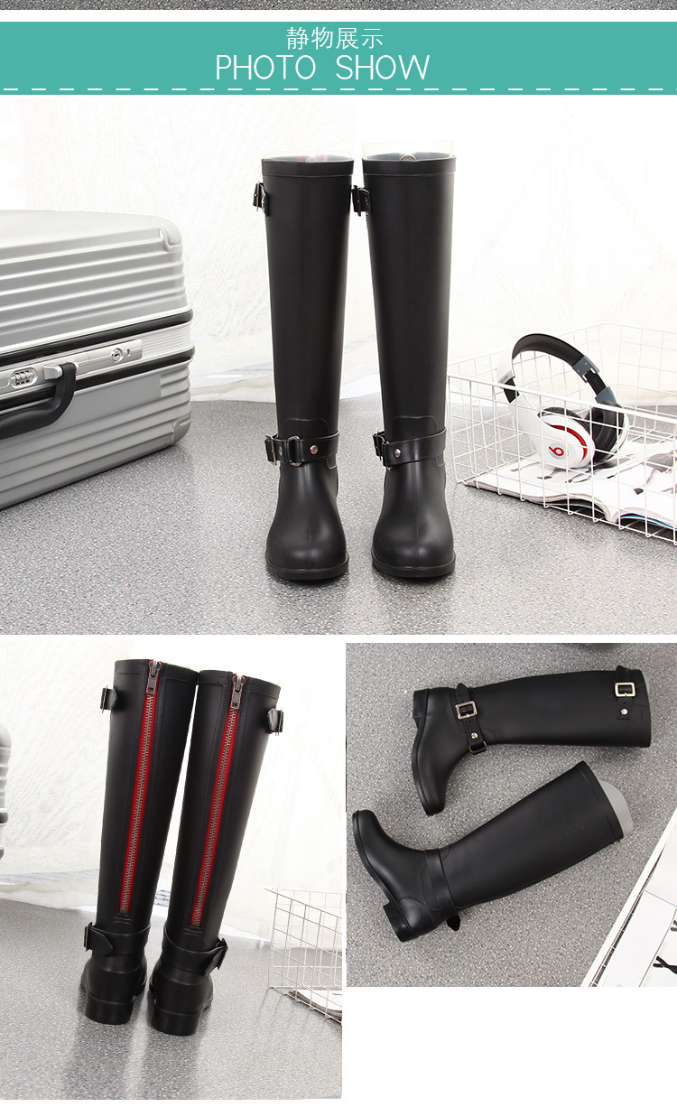 大牌骑士风格晴雨靴,红色拉链设计既起到时尚点缀 又让长筒靴穿脱方便自如。穿起它显的腿型细长 是您雨季大气场的选择!