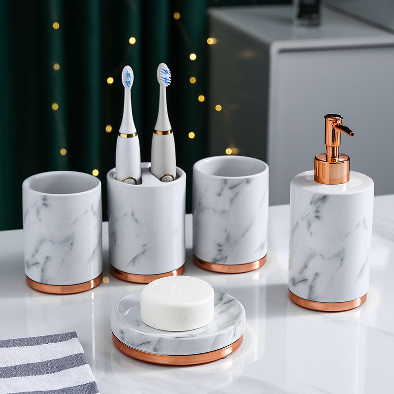 국경 간 노르딕 대리석 패턴 세라믹 욕실 워시 세트 5 피스 세트 서브 팩 손 소독제 비누 칫솔 홀드