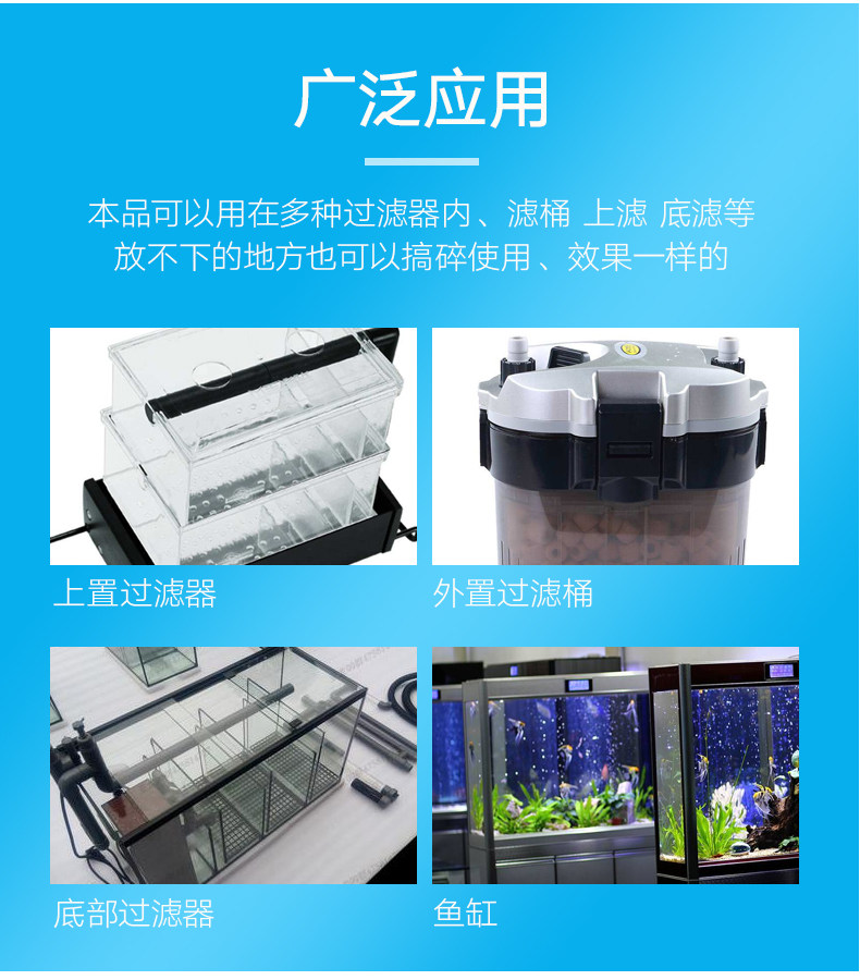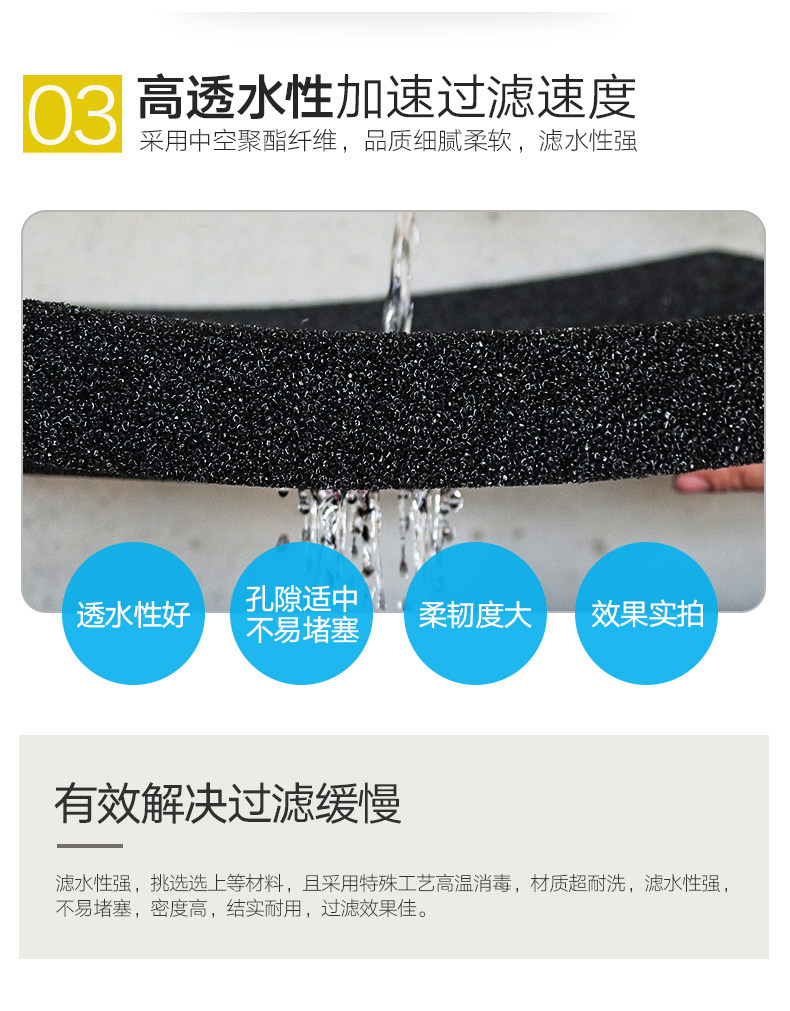 采用优质材料精致而成,具有空隙大,质量高,不易破损等众多优点,非常适合在鱼缸中用作物理及生化过滤使用。采用整张设计,可以按照需要剪成任何形状,使用更加方便。