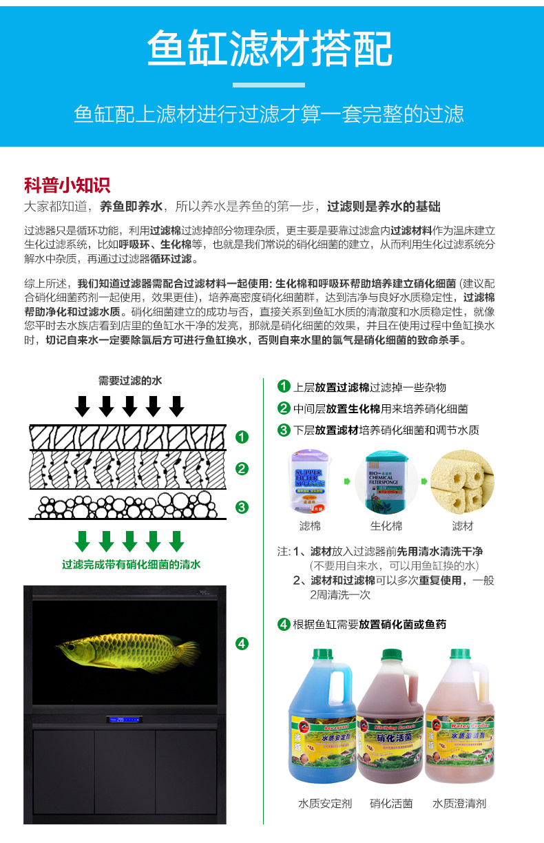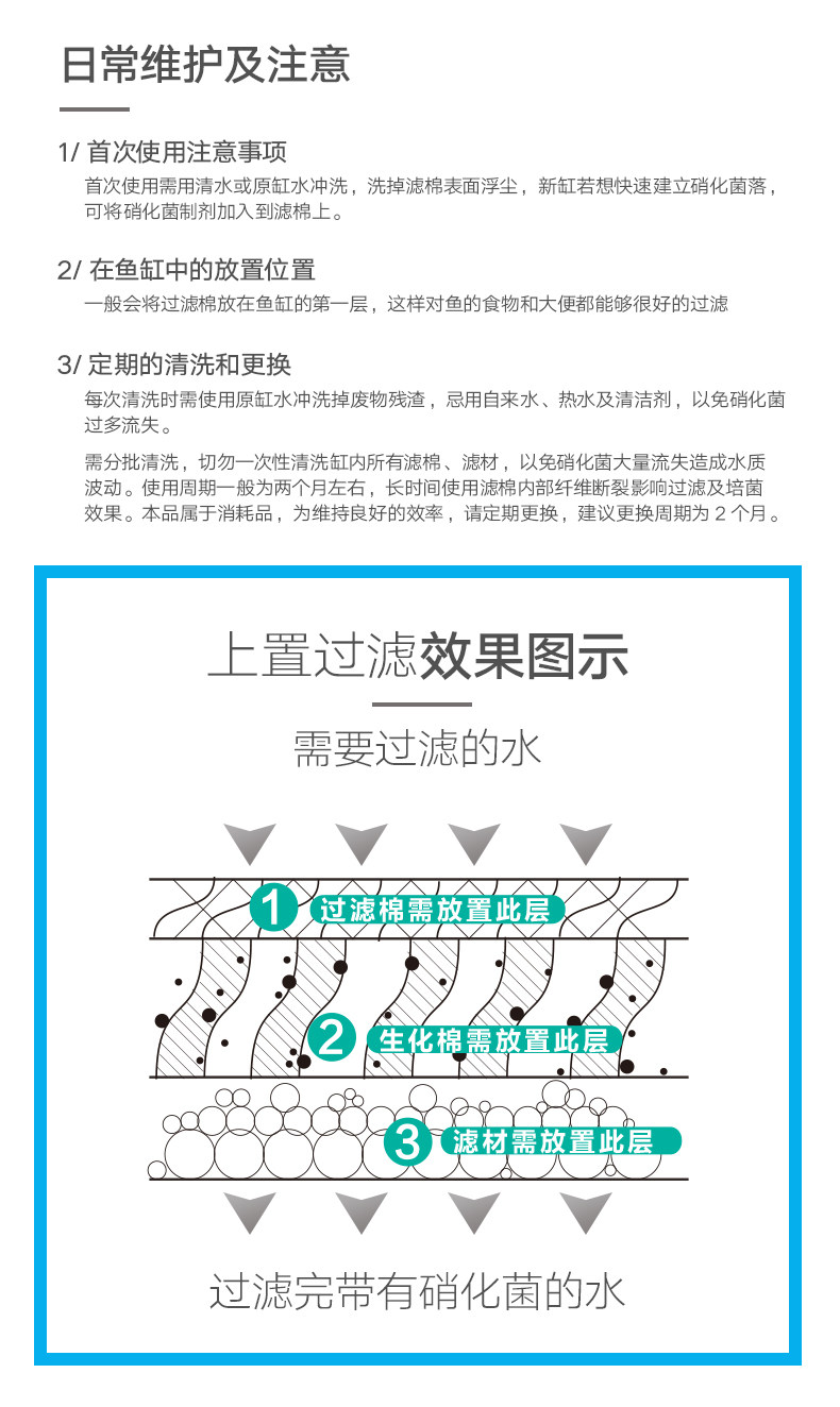 1,本产品适用于海水缸,淡水缸,水草缸。 2,密孔间隙及柔软度,适合培养优良硝化菌之温床。 3,生化棉对分解排泄物及饲料残渣,改善水质过滤清洁。效果佳。 4,本品清洗请用鱼缸水(不含氯气水)清洗.