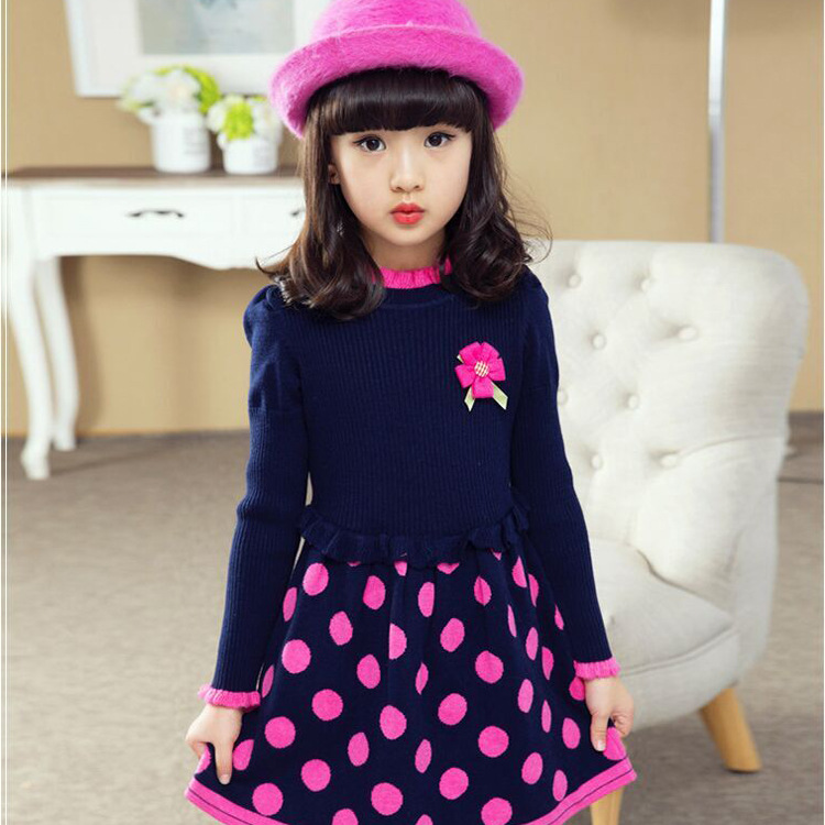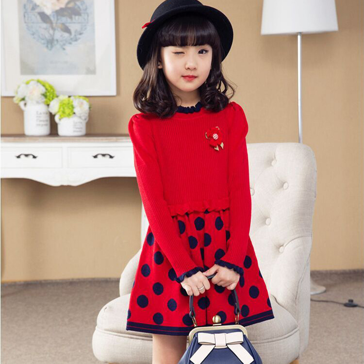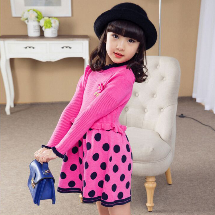 소녀의 원피스 새로운 아동복 대형 어린이 스웨터 목 레이스 도트 꽃 바느질 공주 원피스