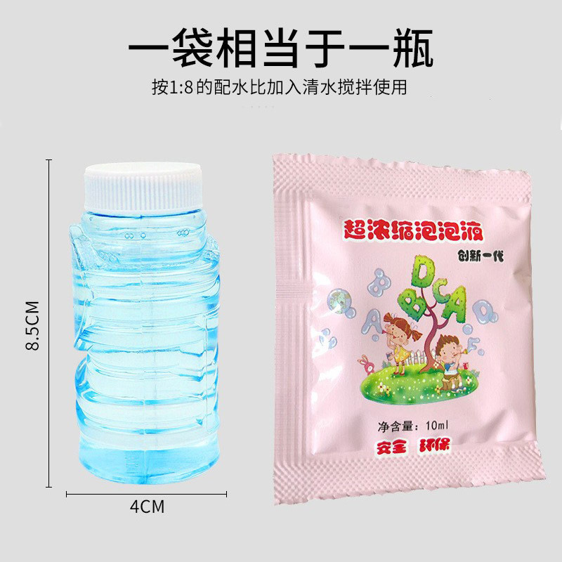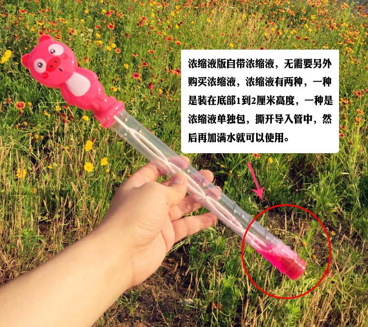 4、关于浓缩液款和装水款区别。装水款是我们机器灌装好泡泡水,直接可以玩。浓缩液款需自己加水,我们自带一根配一包15毫升或者20毫升的浓缩液,没有勾兑比例,直接撕开倒入加满整根水即可。
