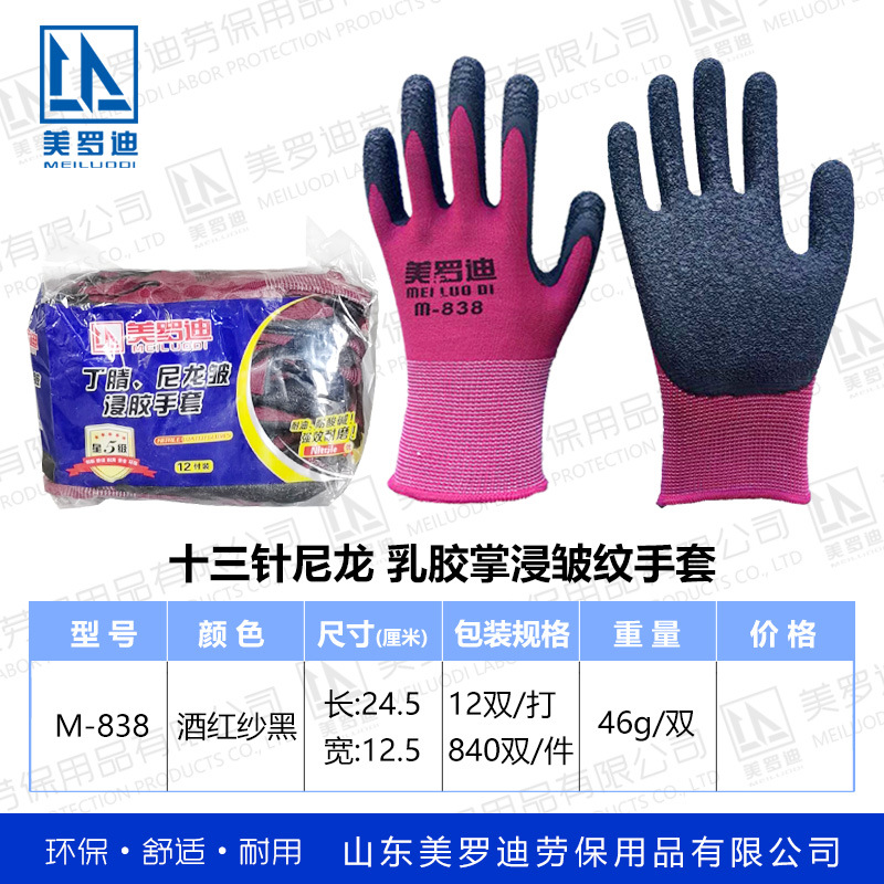 Merodi M-838 버건디 나일론 원사 라텍스 주름 노동 장갑 내마모성 미끄럼 방지 통기성 보호 장갑
