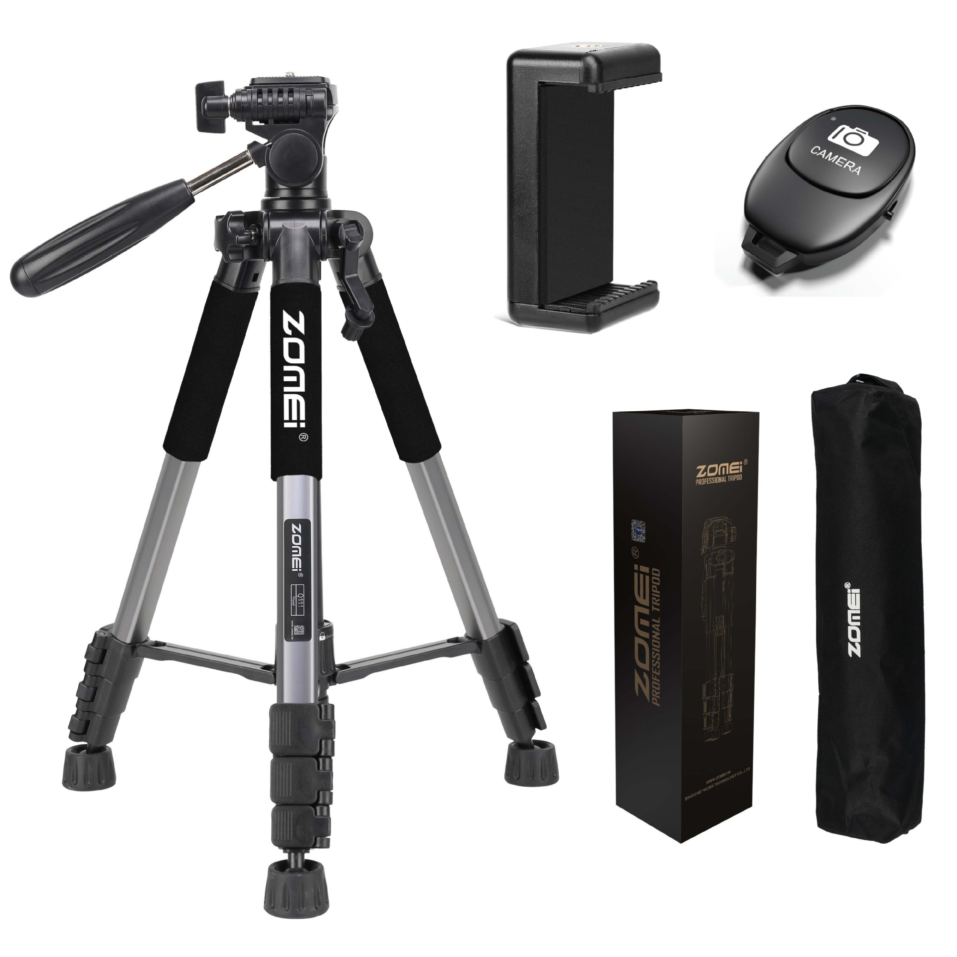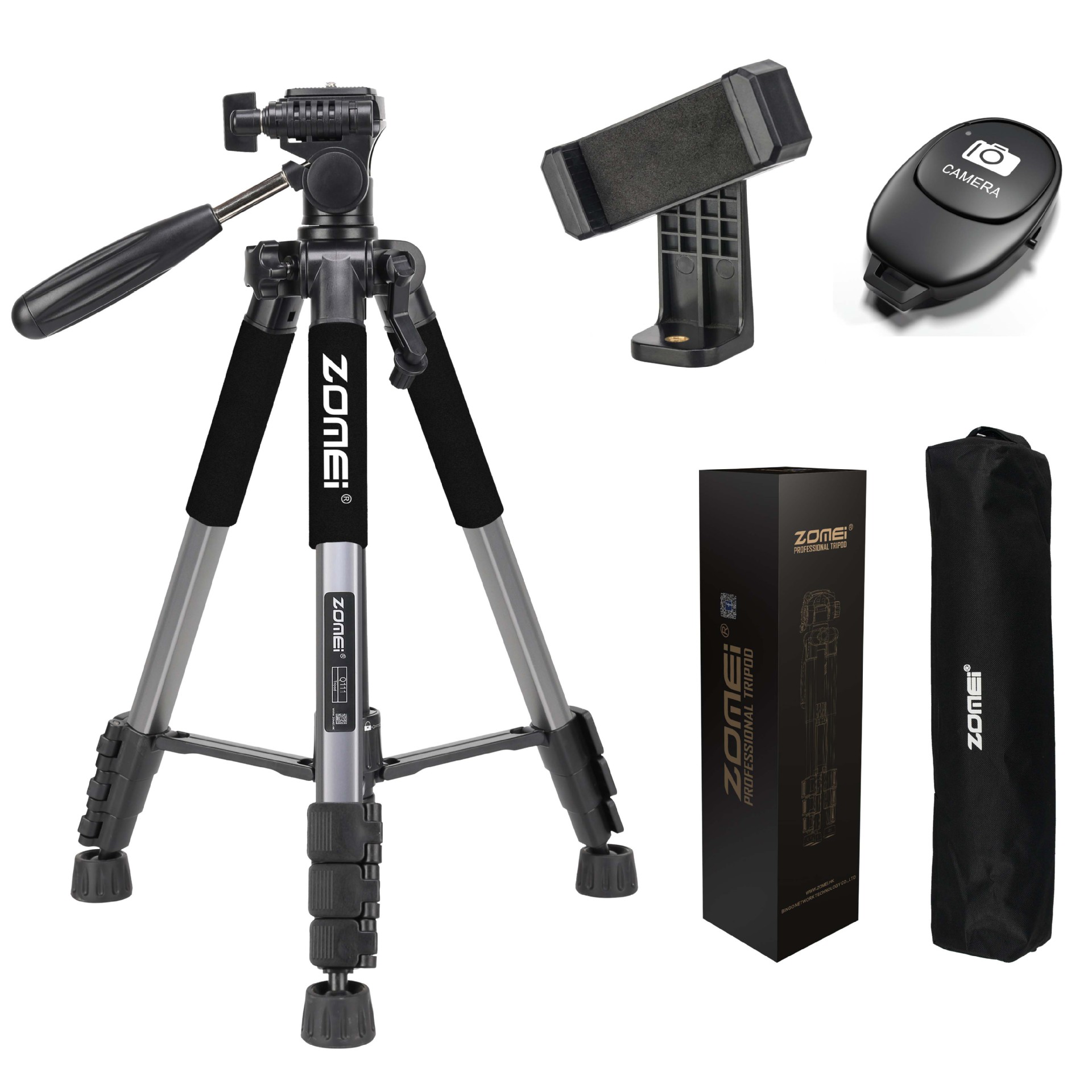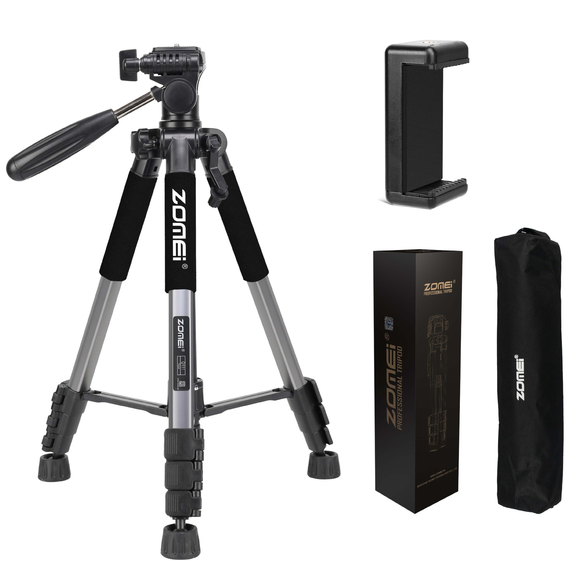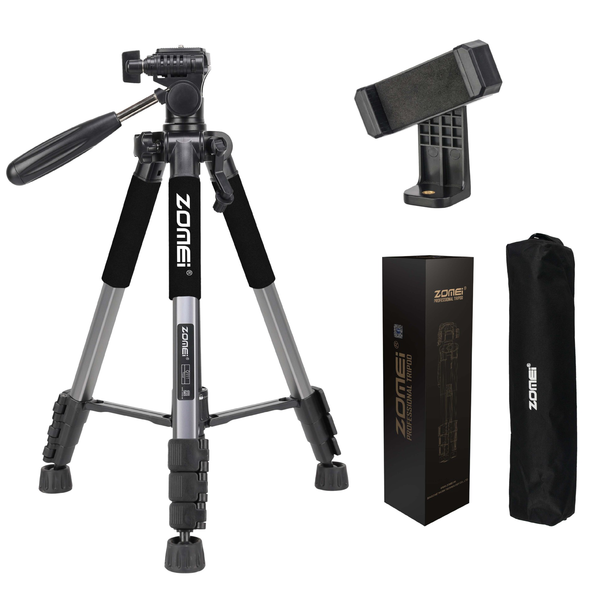 • Q111 실버 그레이 삼각대 + 조절 가능한 휴대폰 클립