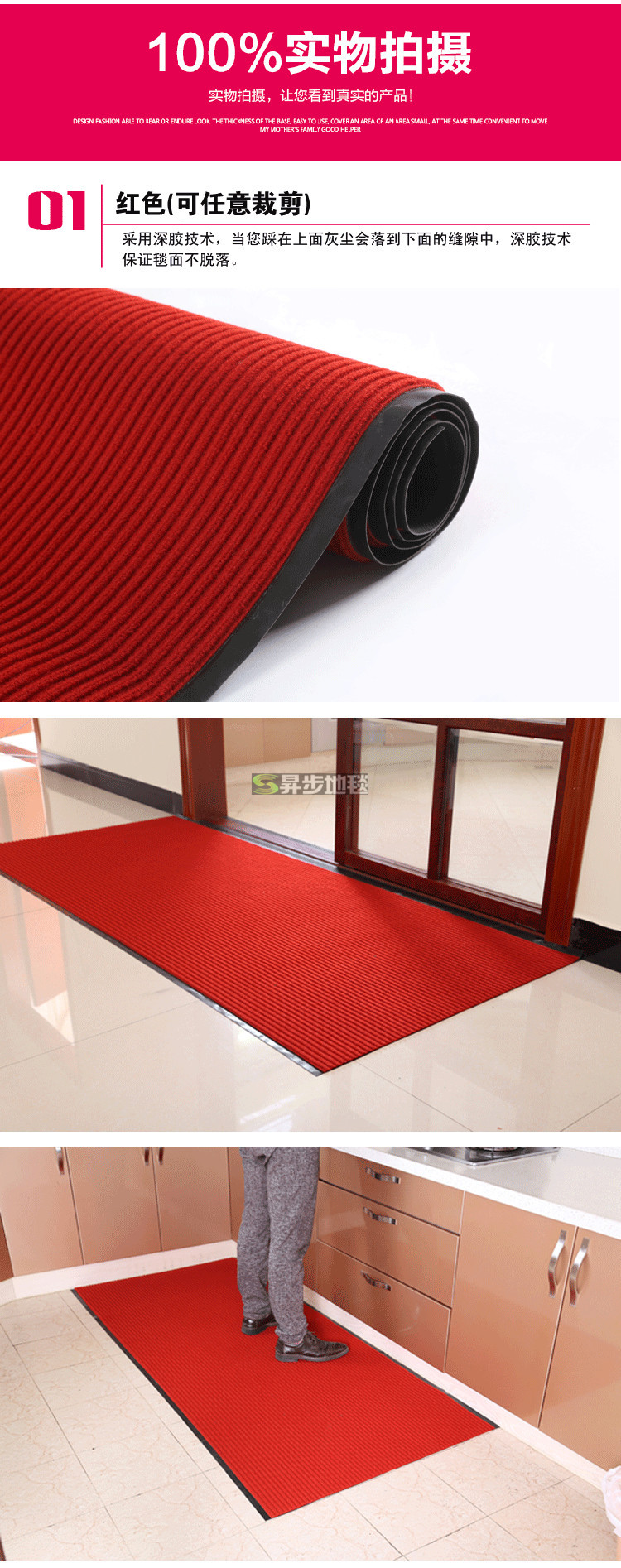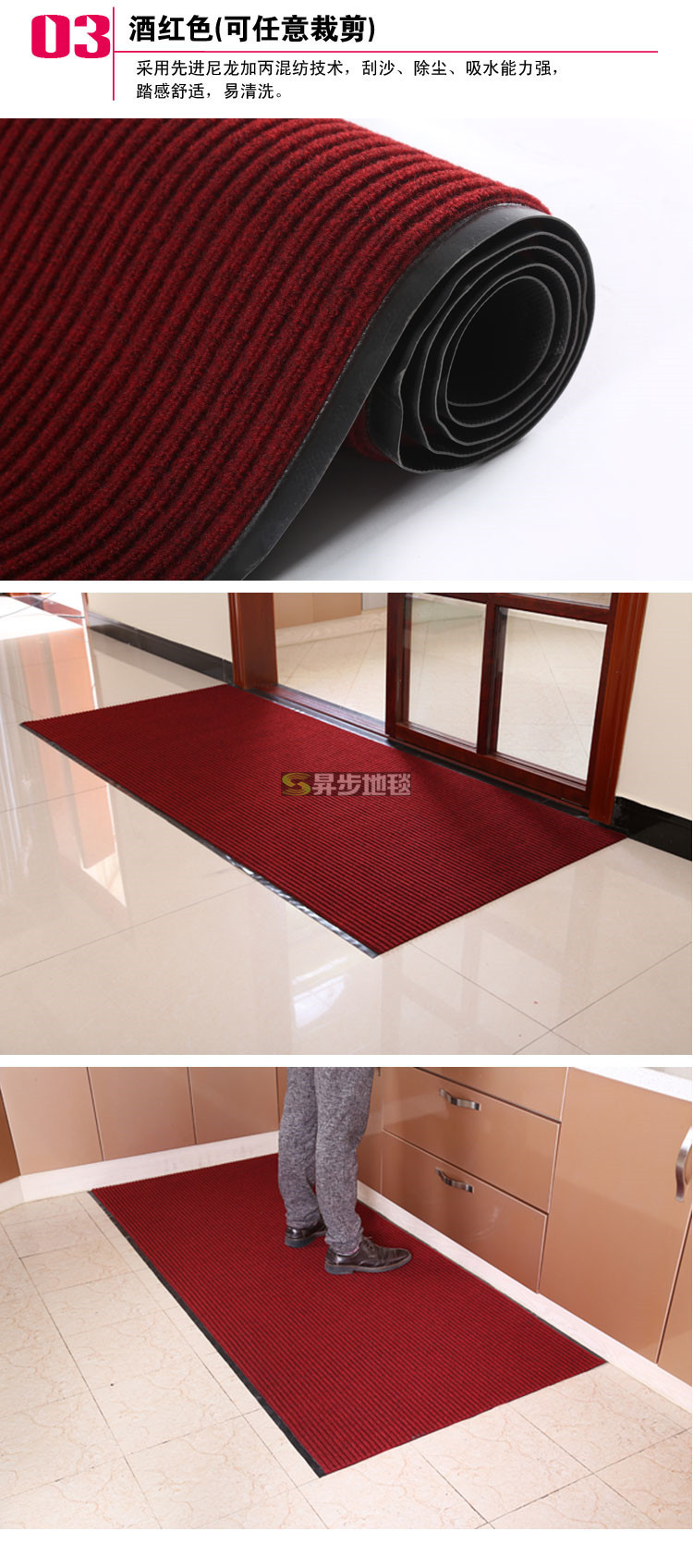 宝贝特点:踩上去舒适、防滑耐用,强力除尘,有效地防止灰尘等外面带回的脏东西。清洗方便,弄脏了用水冲一冲晾干即可,亦可用刷子清洗。
