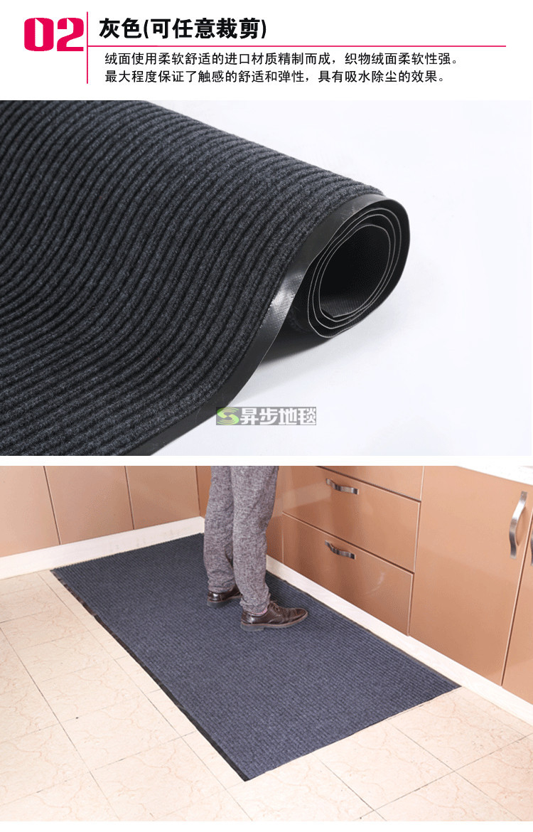 本品表面是绒面,防尘防水底是PVC,防腐防滑,适合室内外有水潮湿的地方不腐不烂经久耐用,性价比高的地垫。