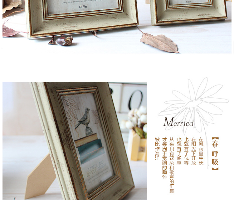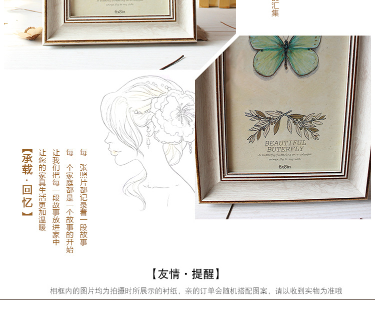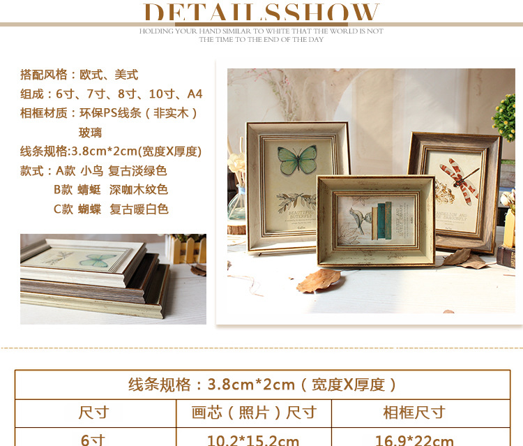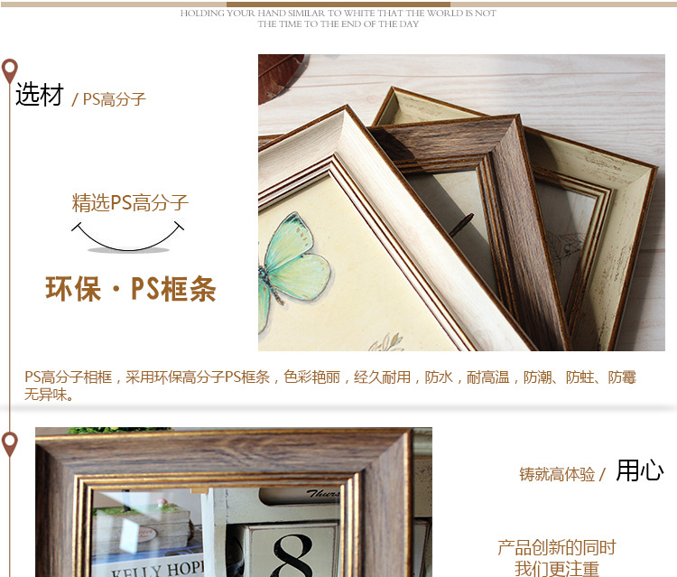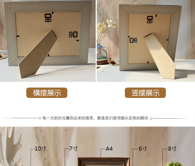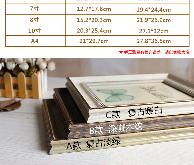 此款创意欧式风格复古相框有6寸7寸8寸10寸A4五种个型号,有3种颜色可更换上自己照片,此款照片相框是玻璃面,通透有质感,PS高分子材质十分有质感。此相框可以当照片摆台也可以当照片墙挂墙上做装饰,一物多用,是款难得的市场热销相框摆件。